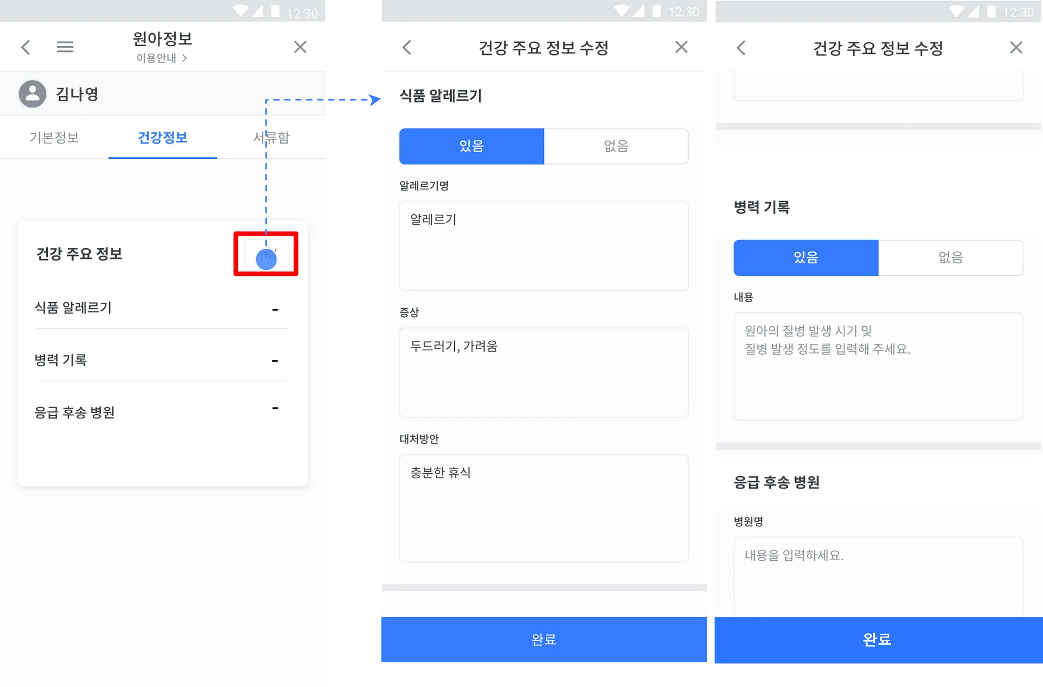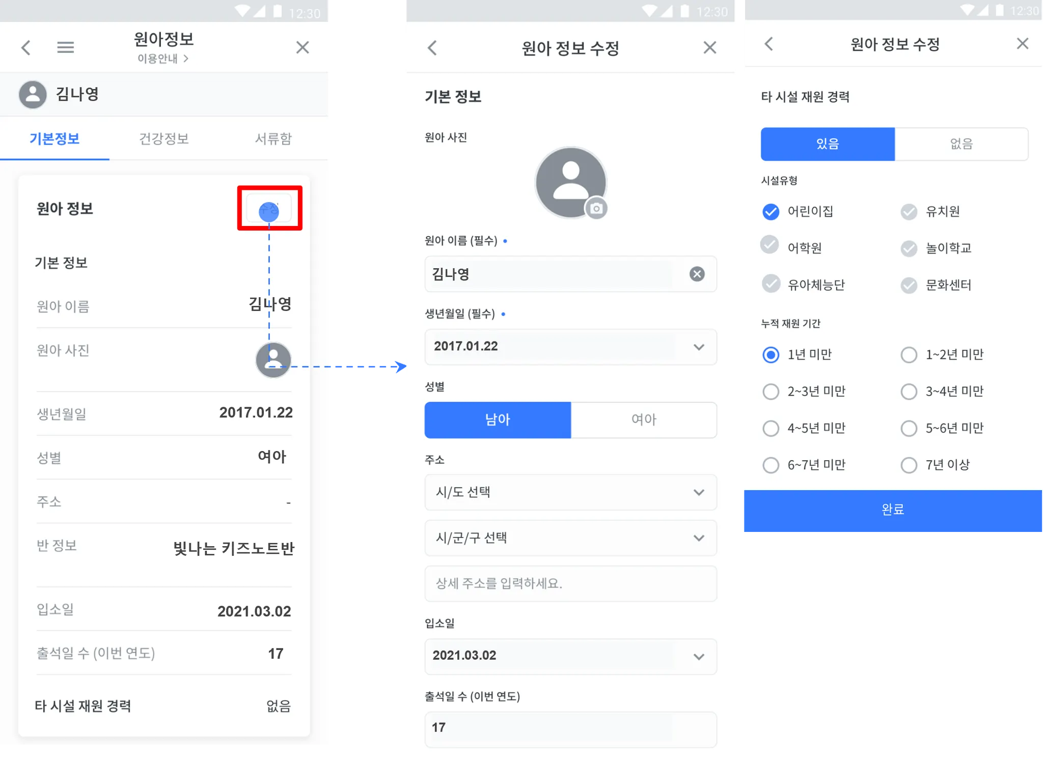 원아 기본정보 수정 : 원아 정보 섹션의 수정 버튼을 선택하고, 내용 수정 후 완료 버튼을 선택하세요.