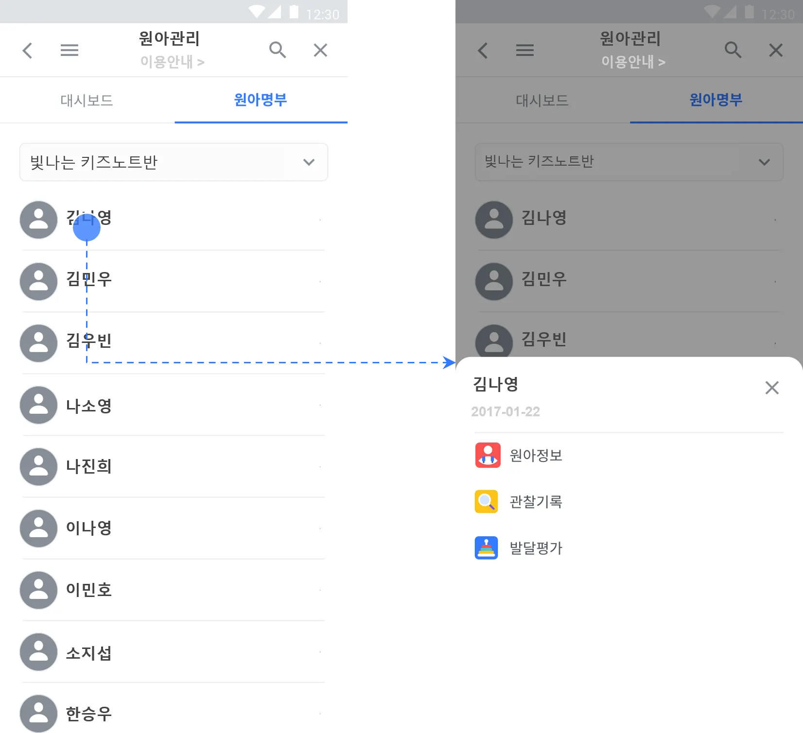 반 별 원아명부 에서 확인이 필요한 원아를 선택합니다.