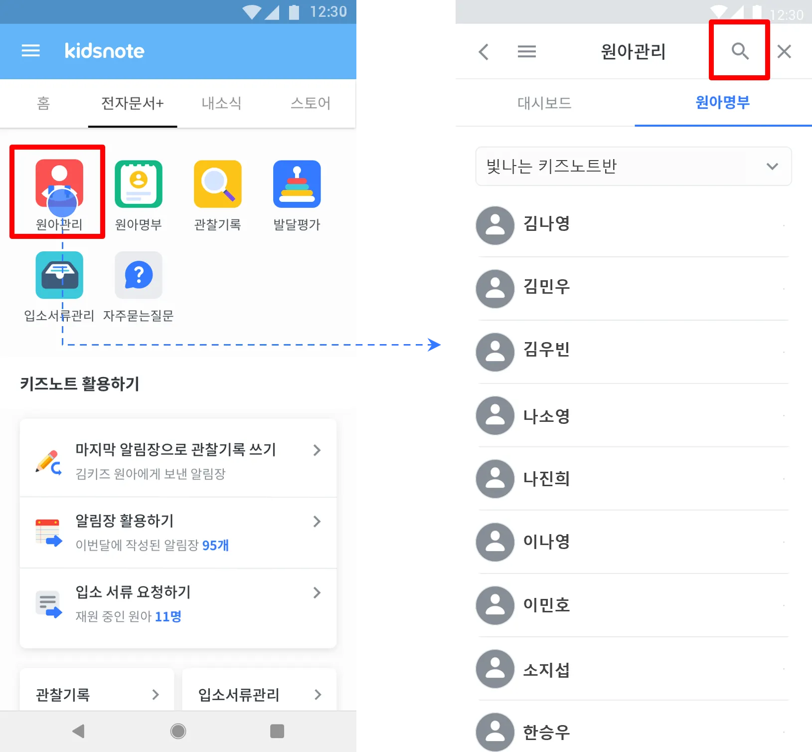 원아 검색하기 : 원아관리 또는 원아명부를 선택해서 우측 상단에 있는 검색(돋보기) 버튼을 선택하시면 담당하고 있는 원아의 이름으로 검색이 가능합니다.