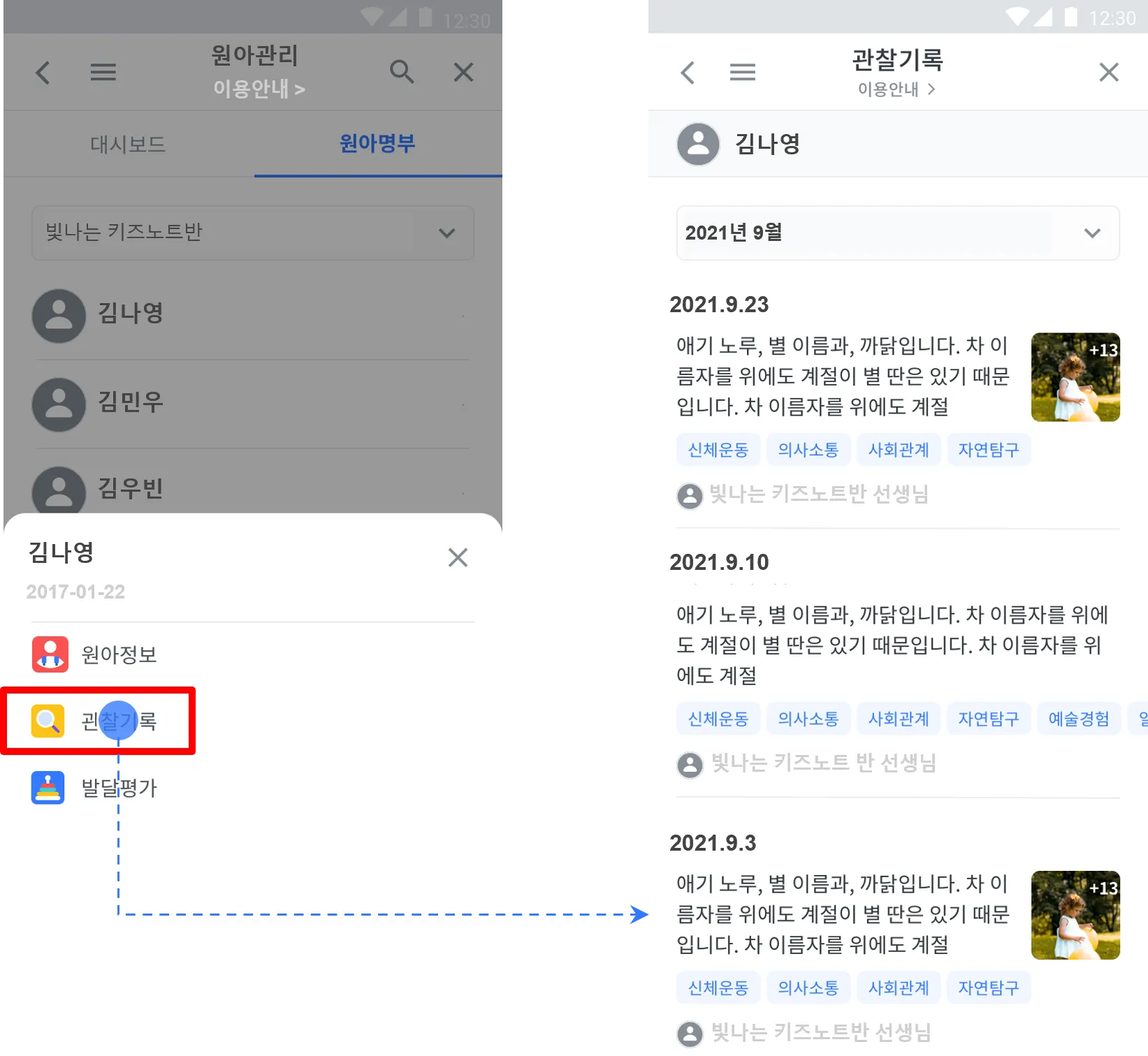 관찰기록 선택 시 원아별 관찰기록을 확인 할 수 있습니다.