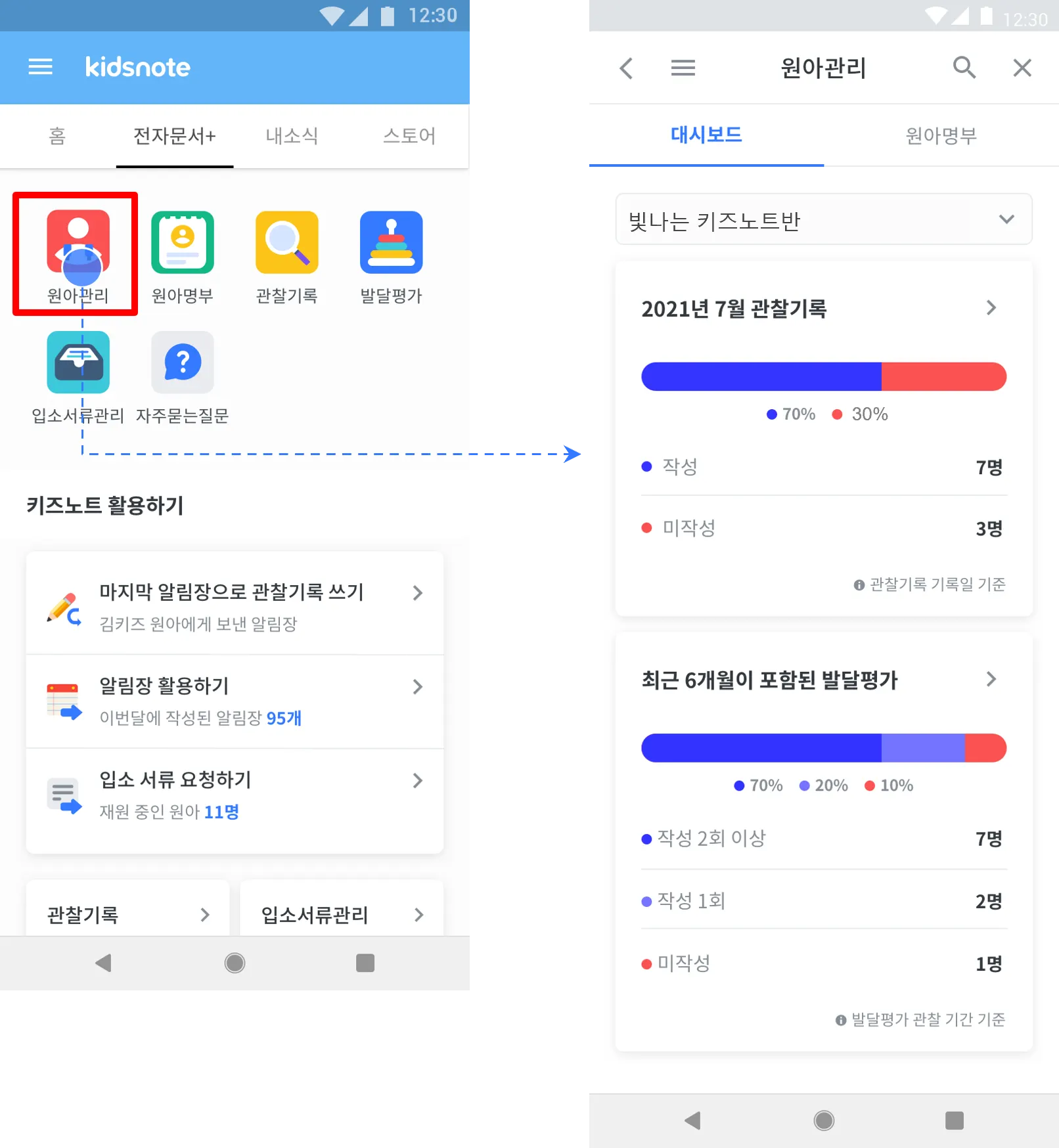 전자문서+ 홈에서 원아관리 메뉴를 선택하면, 대시보드에서 반 별로 관찰기록과 발달평가 작성현황을 확인 할 수 있습니다.