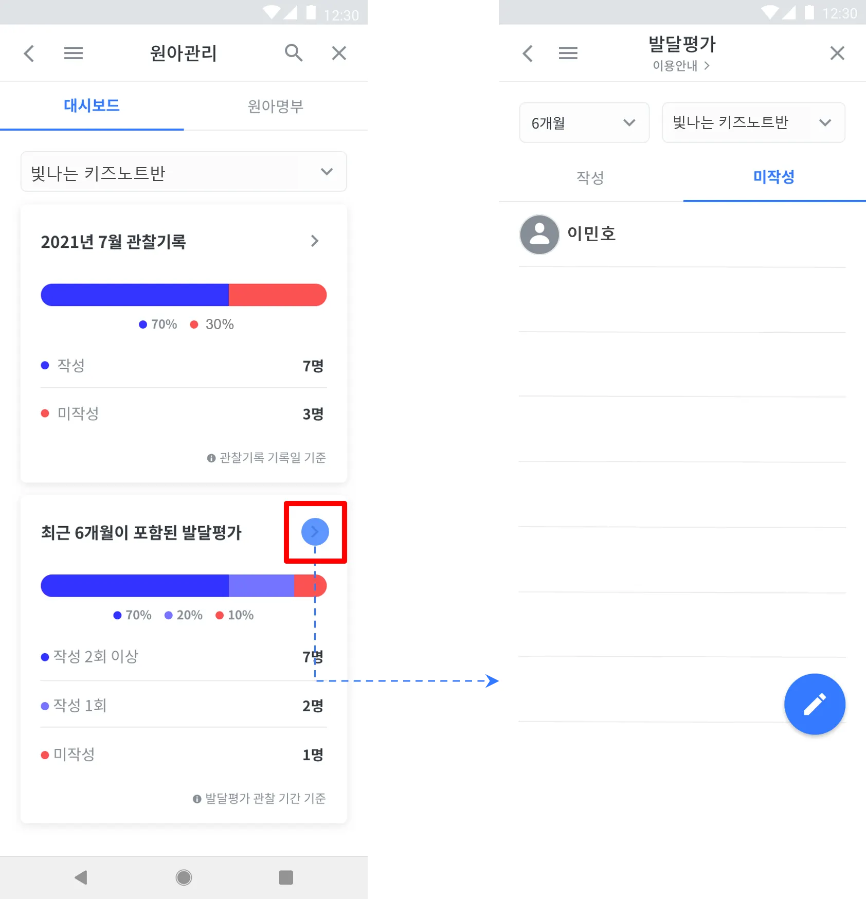 원아관리 대시보드 발달평가 작성현황에서 화살표를 클릭하시면, 발달평가 미작성화면에 진입하여 미작성된 원아를 확인하실 수 있습니다.