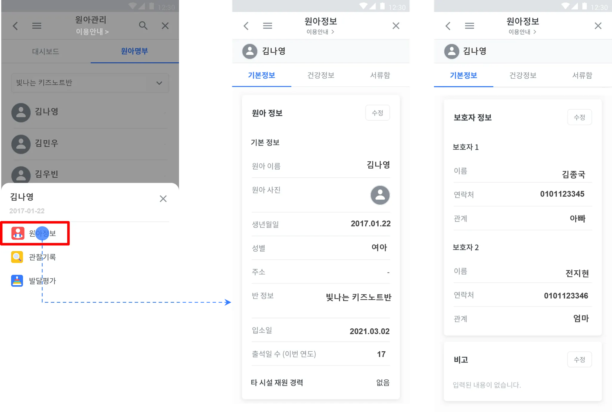 원아 기본정보는 원아 정보, 보호자 정보, 비고로 구성되어 있습니다.