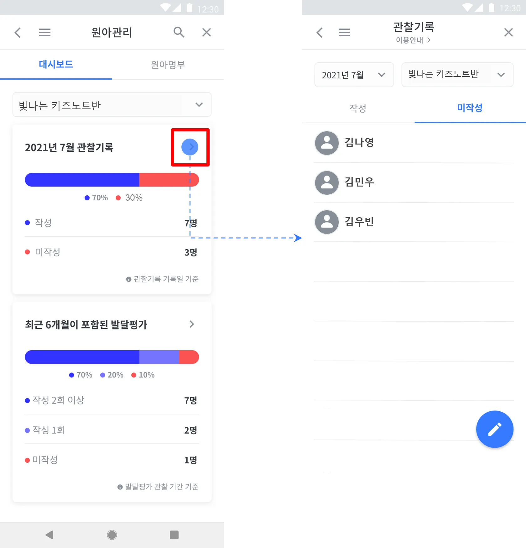 원아관리 대시보드 관찰기록 작성현황에서 화살표를 선택하면, 관찰기록 미작성화면에 진입하여 미작성된 원아를 확인하실 수 있습니다.