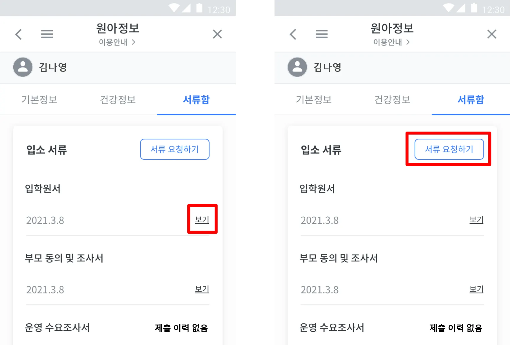 - 입소서류관리 메뉴를 통해 원아의 기본정보, 건강정보를 제출받은 이력이 있다면 제출받은 내용이 보여집니다.