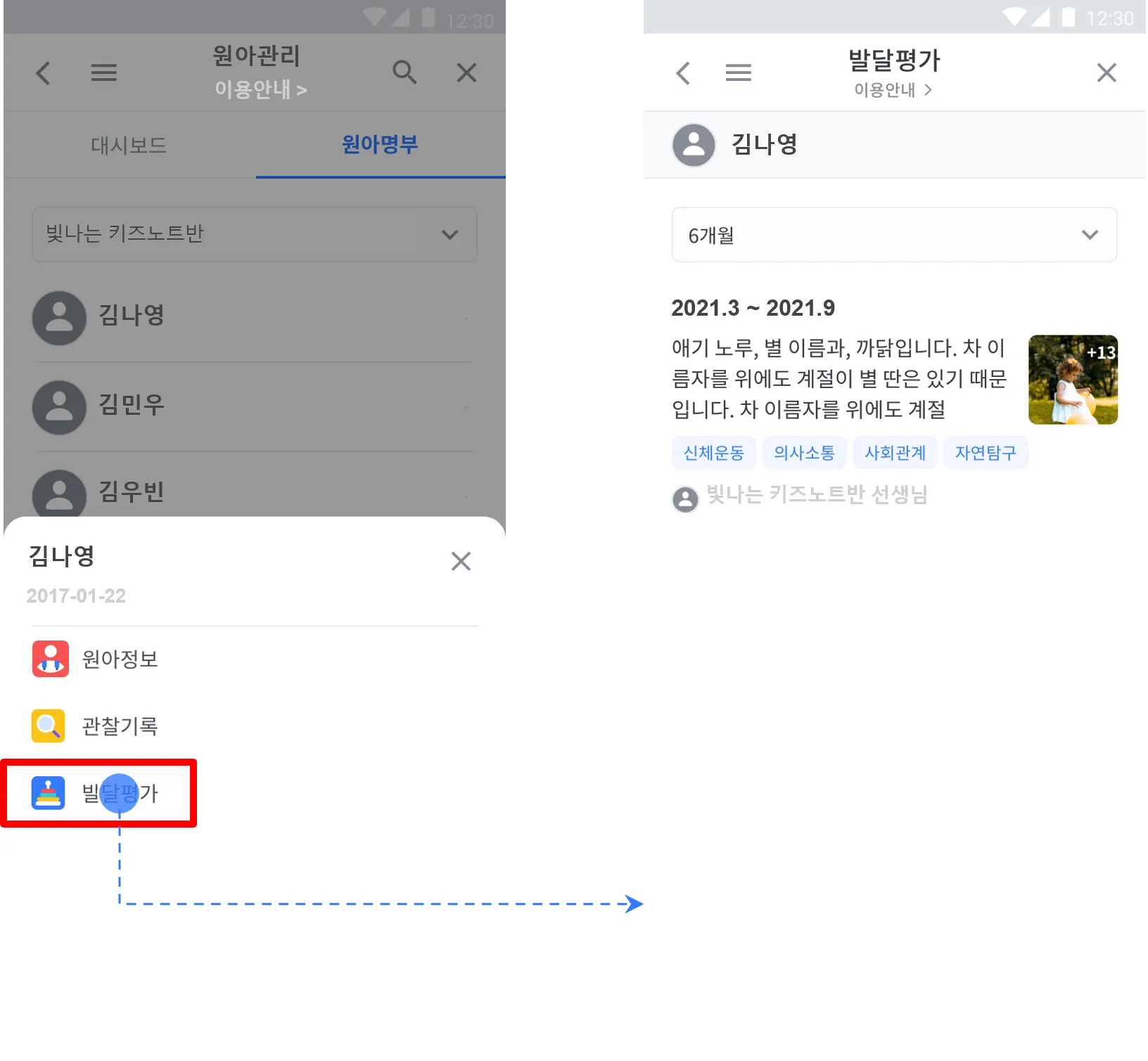 해당 원아의 원아정보 관찰기록 발달평가 메뉴를 선택하면 각 메뉴로 이동합니다.