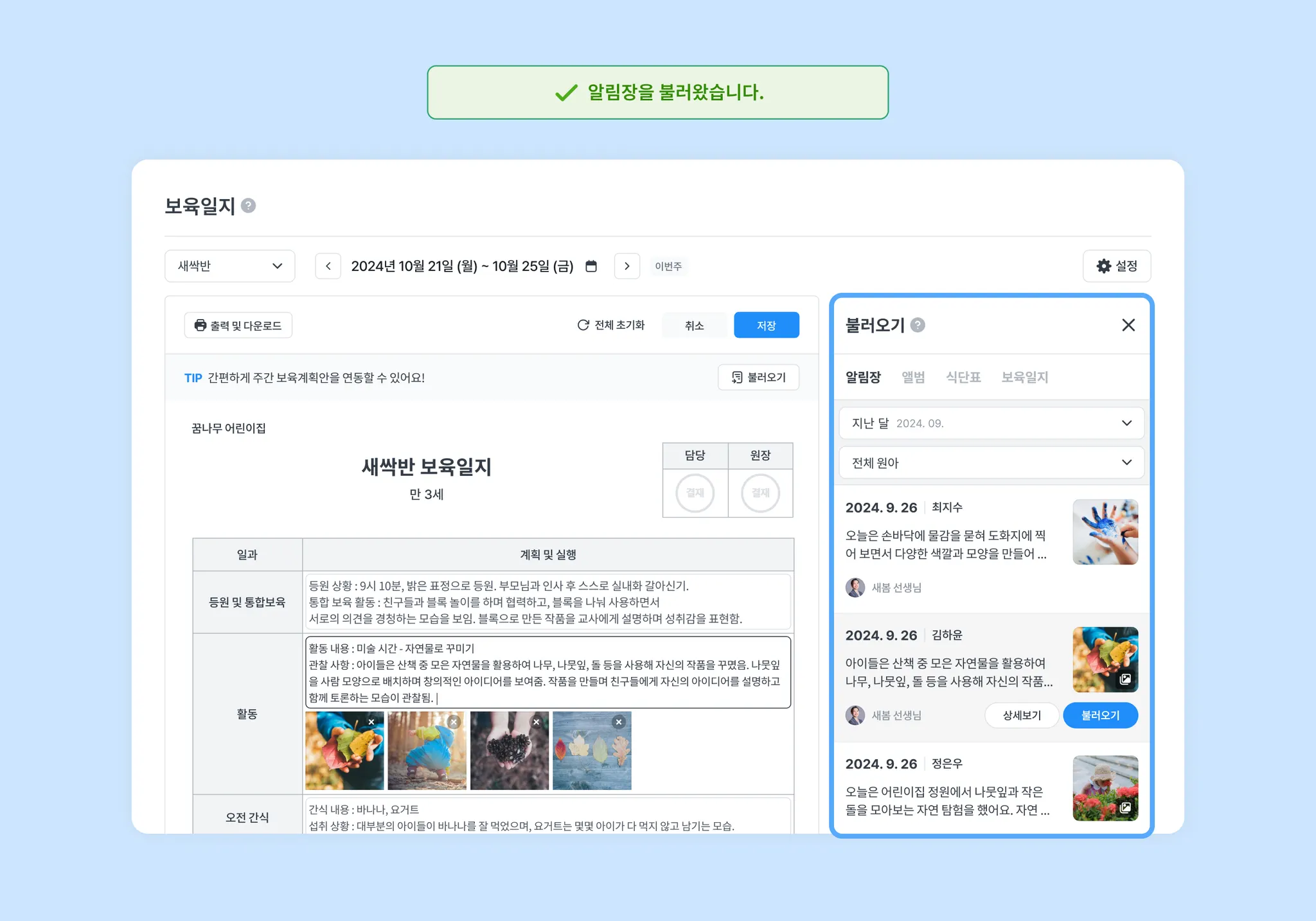 알림장, 식단표도 보육일지로 불러올 수 있어요.