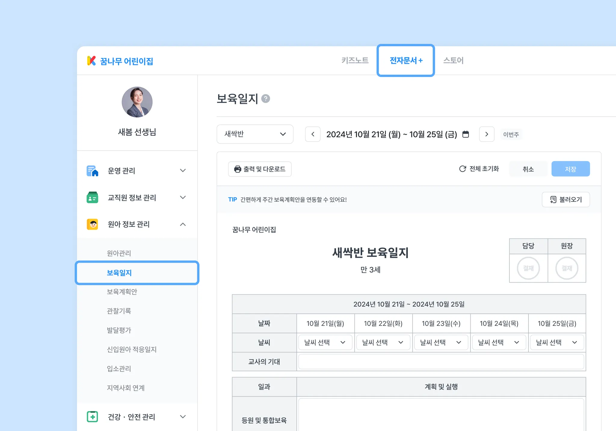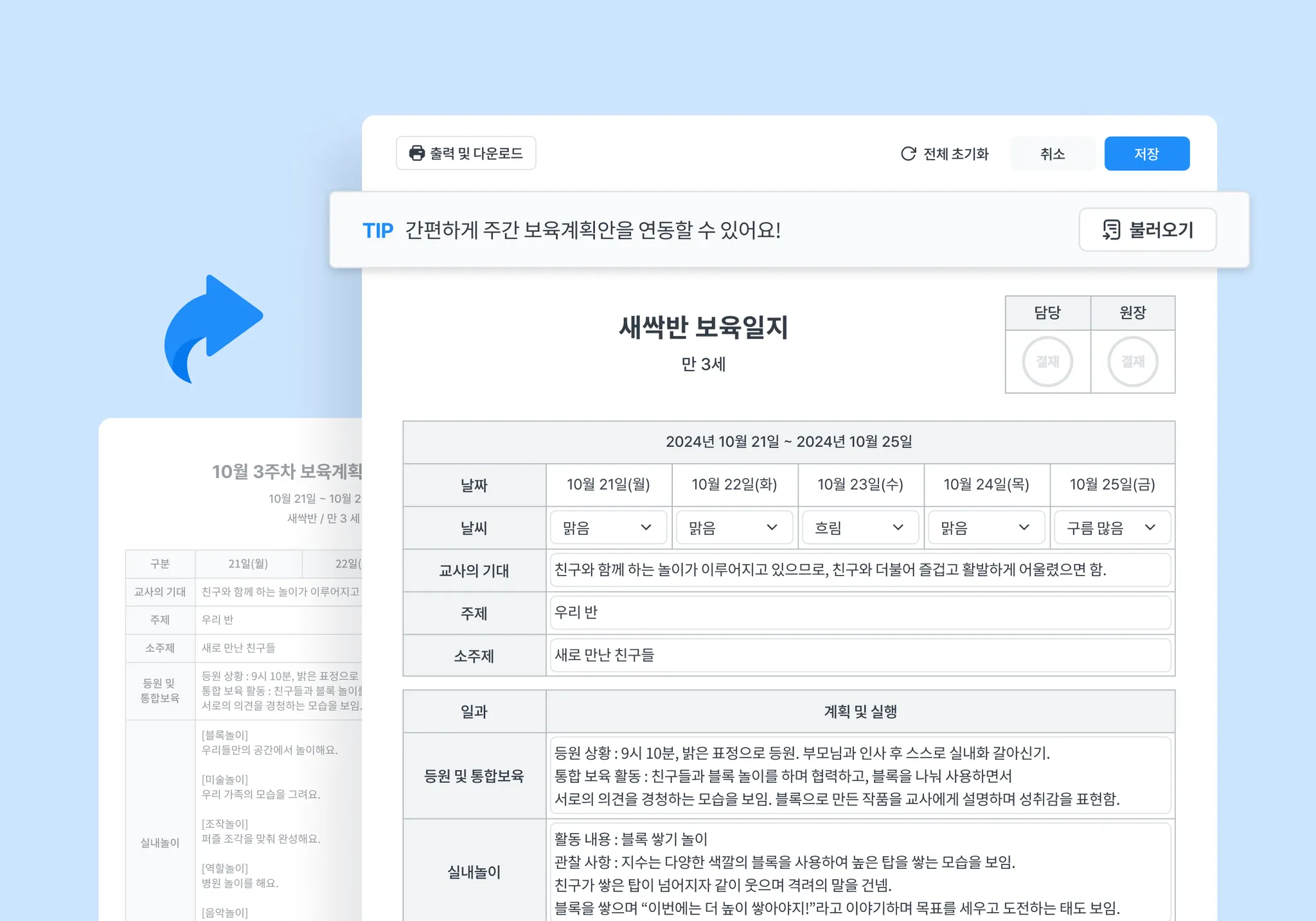전자문서+ 주간 보육계획안을 보육일지로 불러올 수 있어요. 계획안에 썼던 활동, 일지에 또 쓰고 하는 번거로움 안녕~