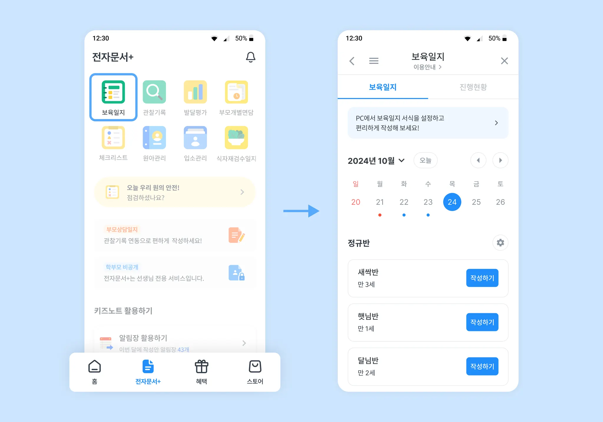 이제 미루지 않고 언제 어디서든 쓰실 수 있도록 키즈노트 전자문서+가 도움을 드릴게요!