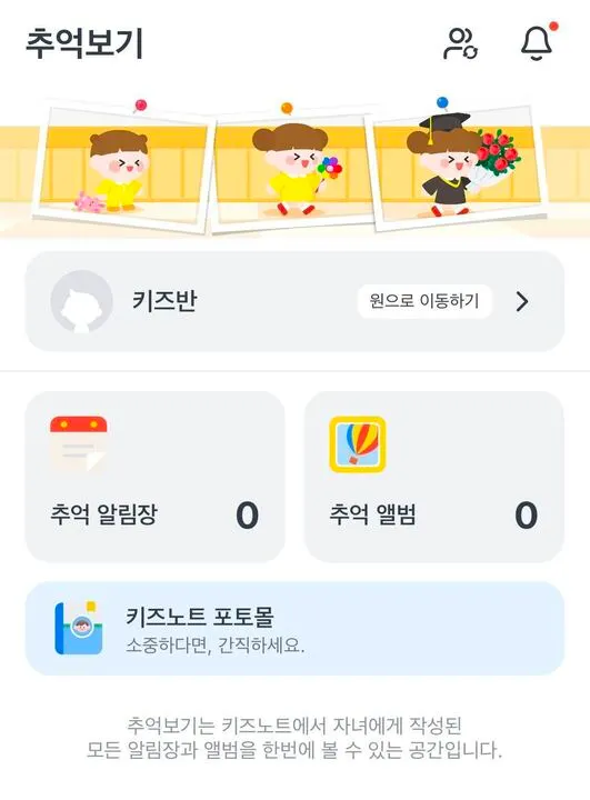 우리 아이에게 저장된 알림장, 앨범을 보실 수 있는 ‘추억보기’ 화면이 홈 화면 업데이트 톤에 맞춰 더욱 예뻐졌어요.