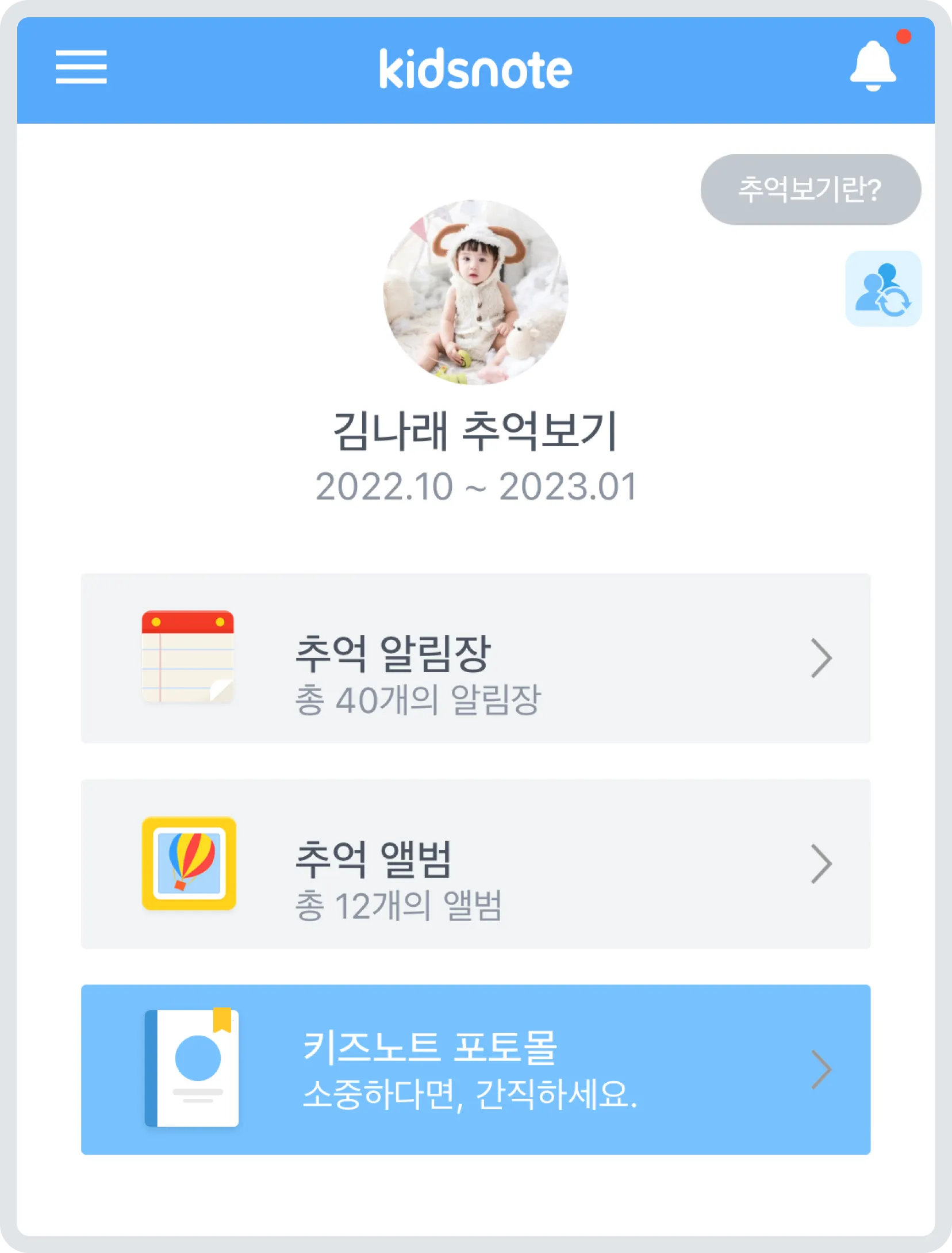 안녕하세요? 아이의 특별한 순간을 함께하는 키즈노트입니다.