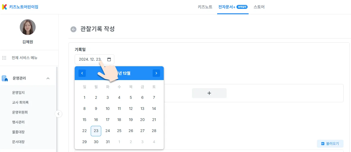 관찰기록 작성 페이지에 선택한 원아가 자동으로 보여집니다.