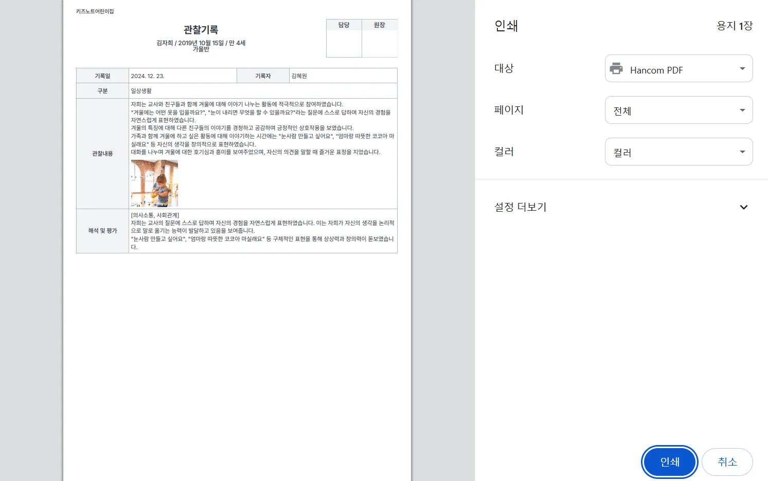 - ‘사진’이 첨부된 관찰기록 출력 시 사진도 포함되어 출력됩니다.