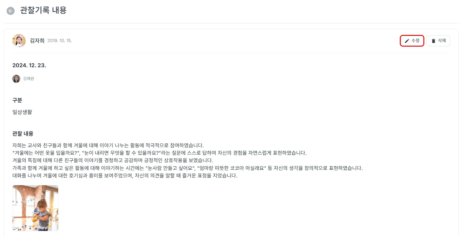 - 기록자의 경우, 원장님 및 해당 원아가 소속된 반의 교사 모두 수정이 가능합니다.