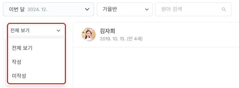 원아명 목록 상단에 전체보기 필터를 선택하면 전체보기, 작성, 미작성 현황에 따라 원아를 조회할 수 있습니다.