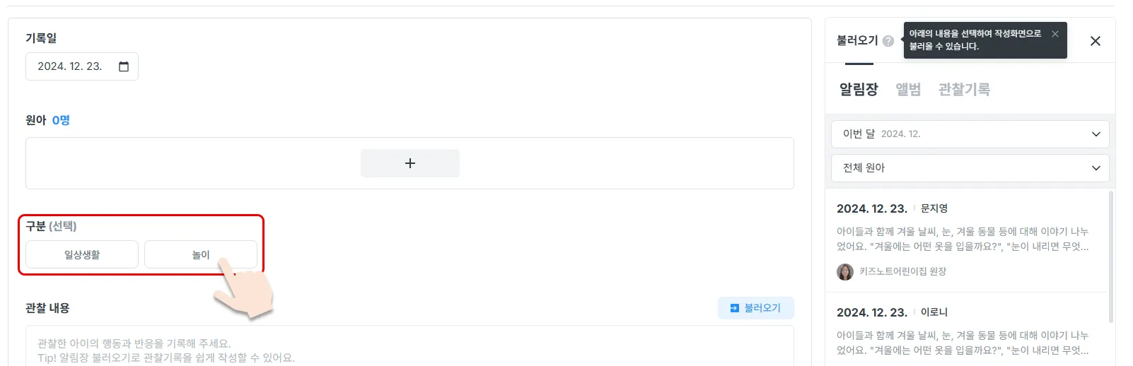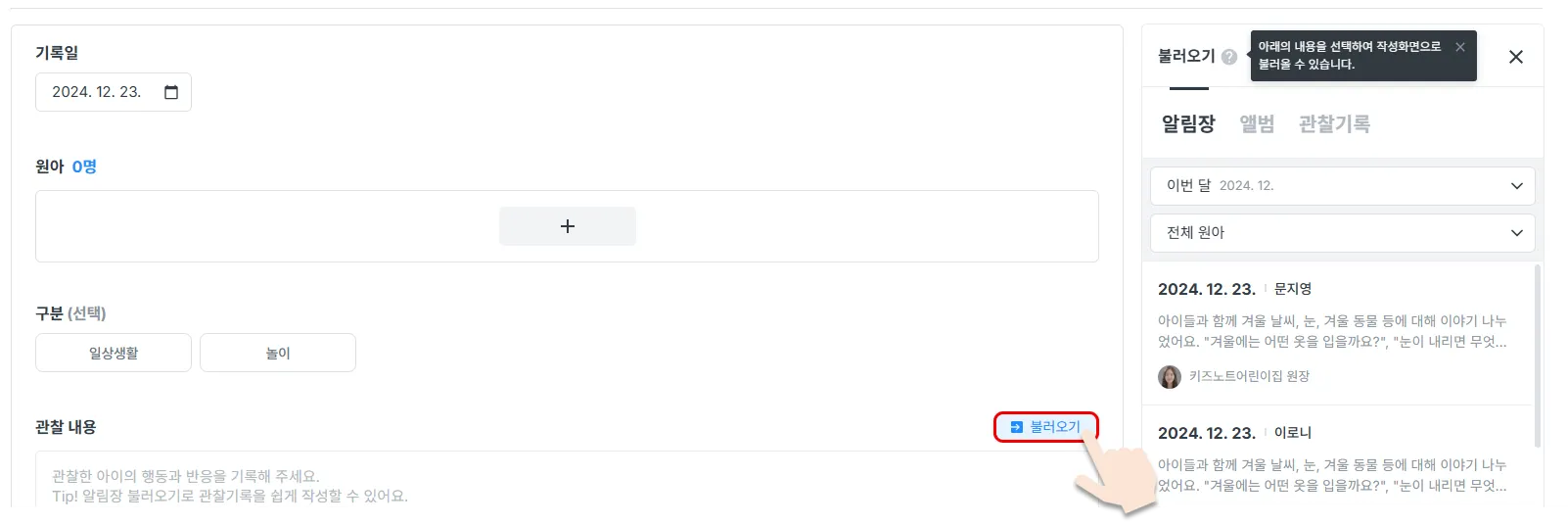 관찰 내용을 작성해주세요. 관찰 내용 우측에 불러오기 버튼을 클릭하면 알림장, 앨범, 관찰기록을 쉽게 불러올 수 있습니다.