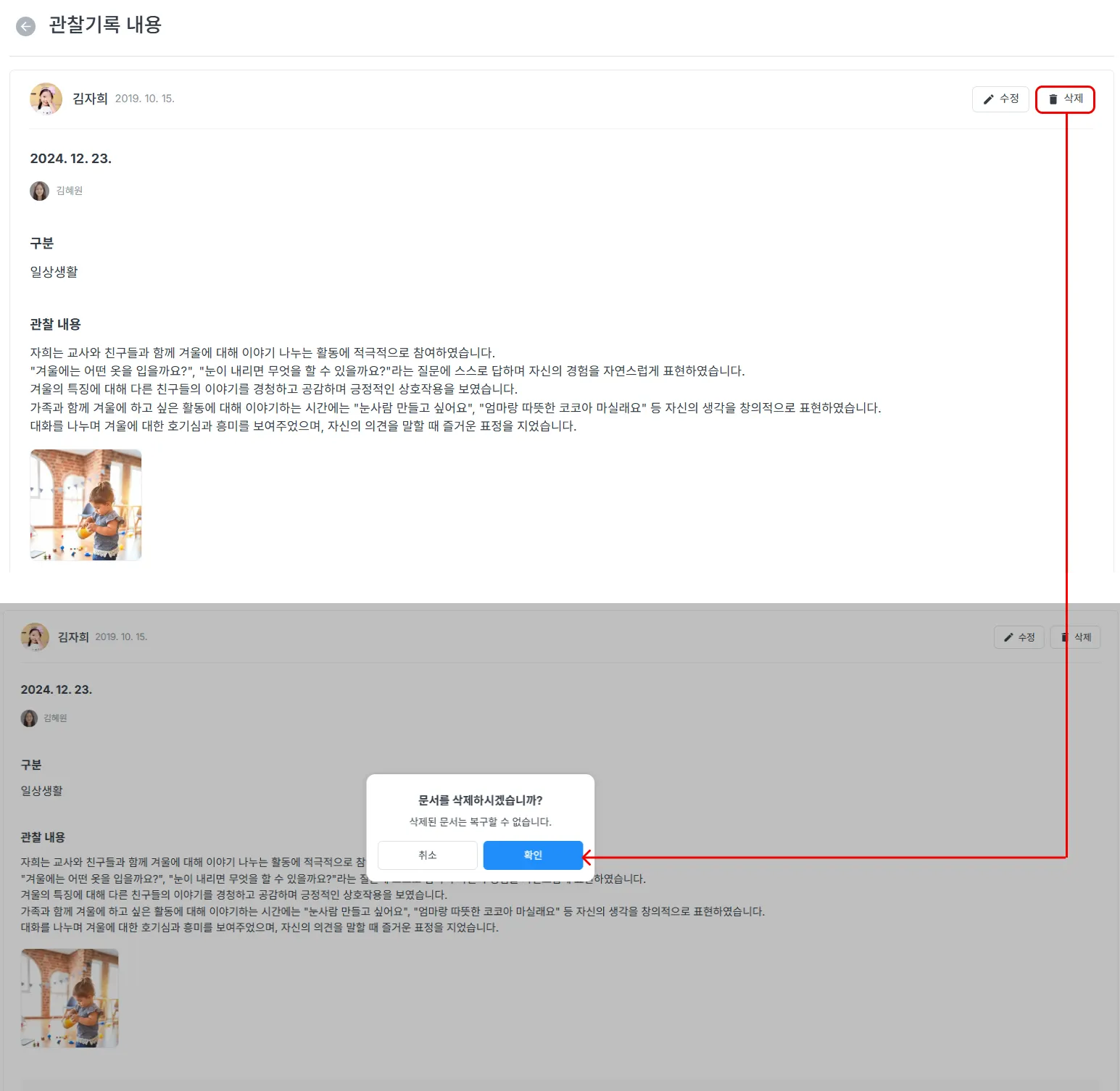 원장님 : 모든 관찰기록에 삭제 버튼이 보여집니다.