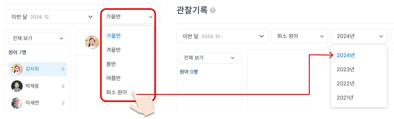반 별로 관찰기록을 조회할 수 있습니다. 퇴소 원아 선택 시 퇴소 연도 선택 필터가 추가로 보여지며, 연도별로 선택하여 조회할 수 있습니다.