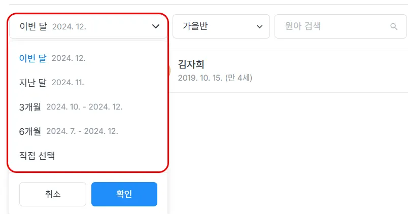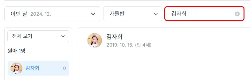 - 우측 화면에서 기간 별, 원아 별, 작성 현황 필터를 조회하여 작성 현황을 확인할 수 있습니다.