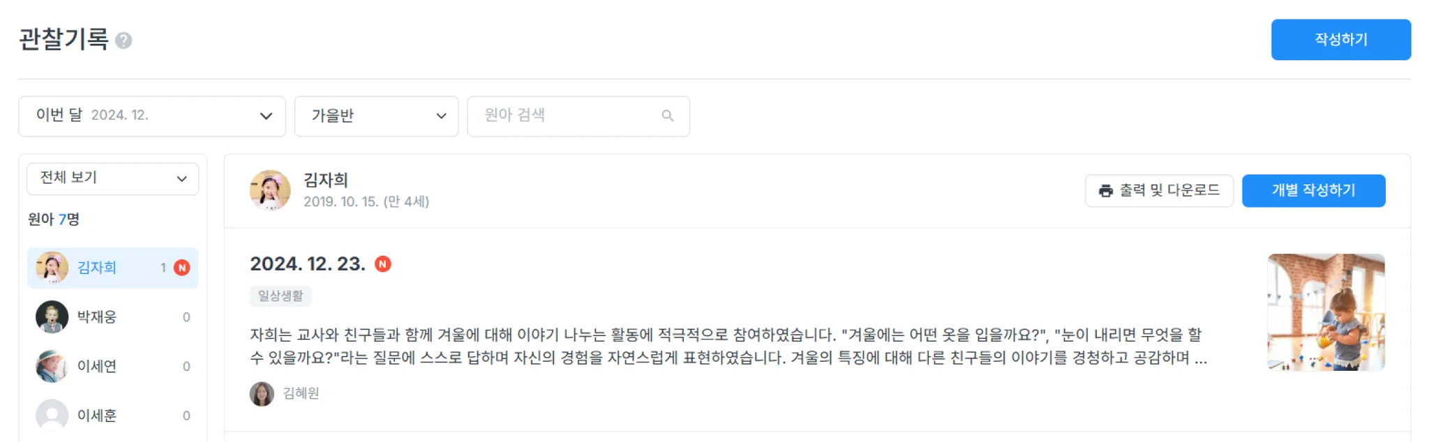 - 작성 : 기간, 반, 원아 검색 조건에 따라 작성된 관찰기록이 1건 이상 있는 원아가 목록에 보여집니다.