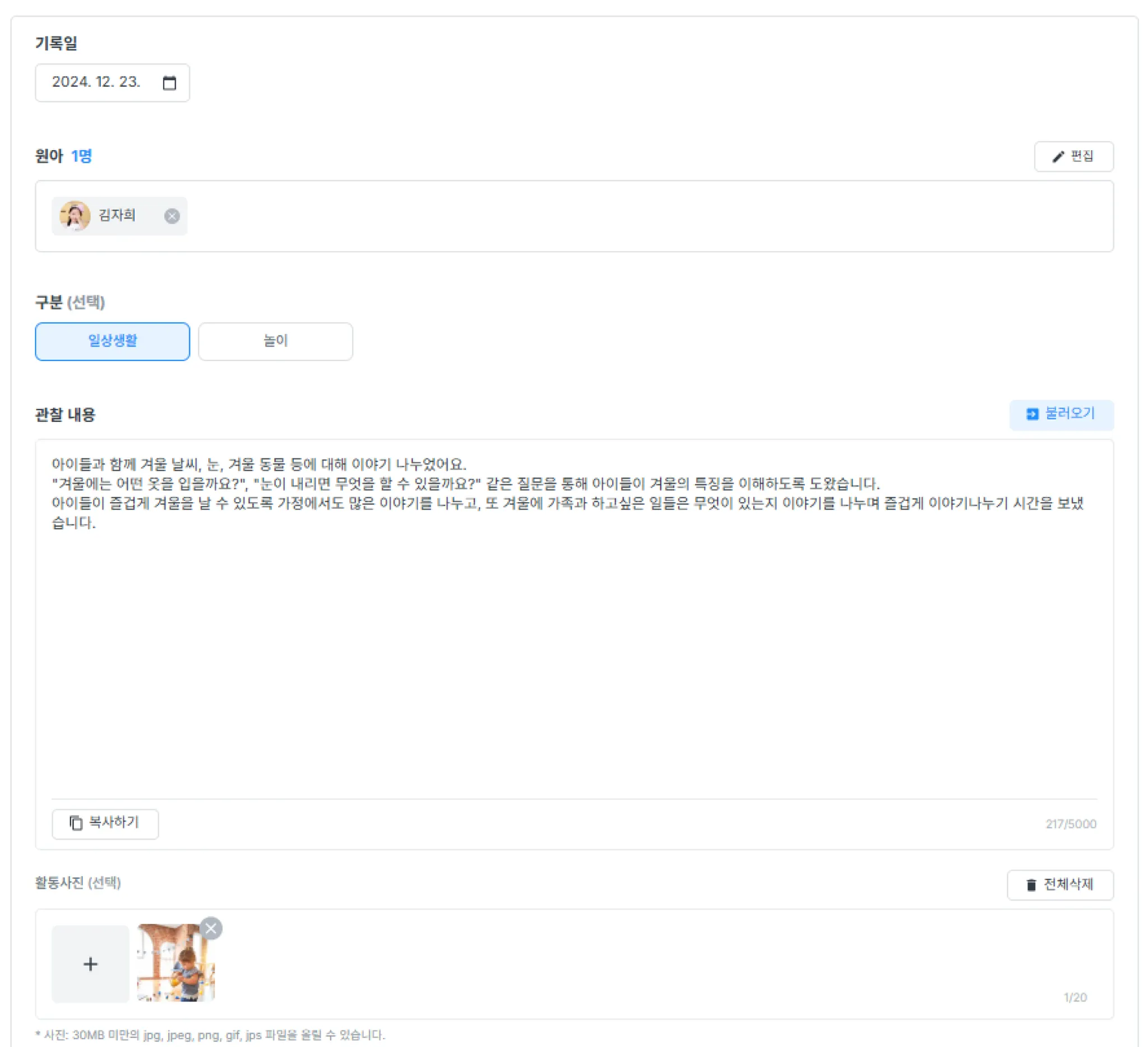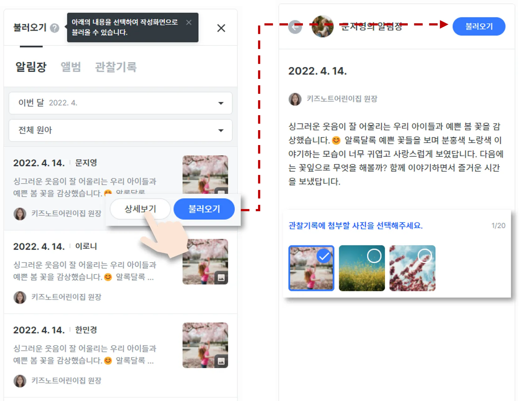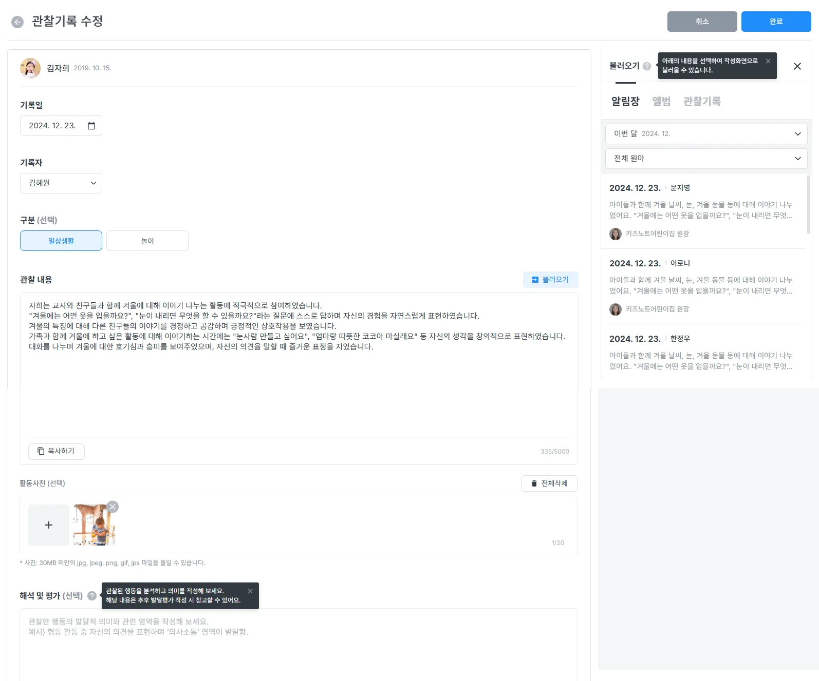 - 불러오기 버튼 선택 시 선택한 알림장 내용과 첨부된 사진이 관찰기록으로 불러와집니다.