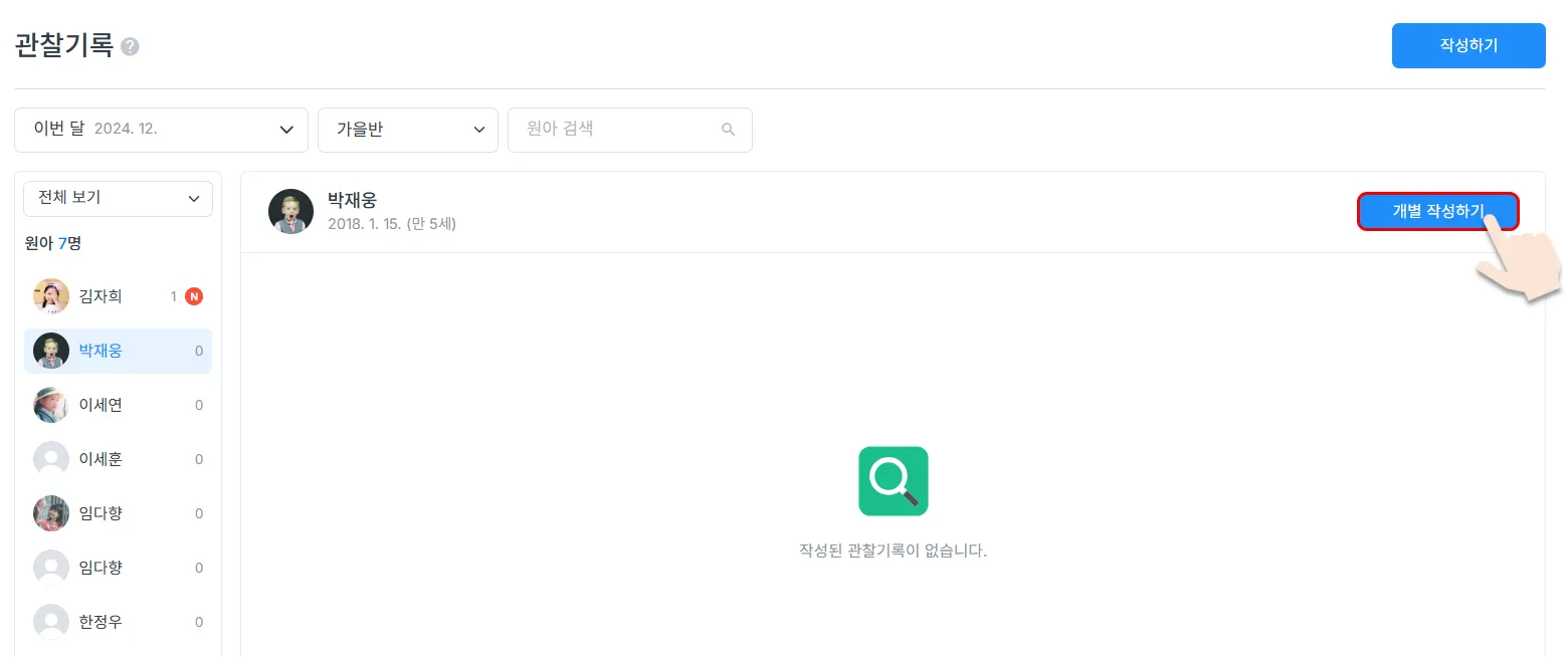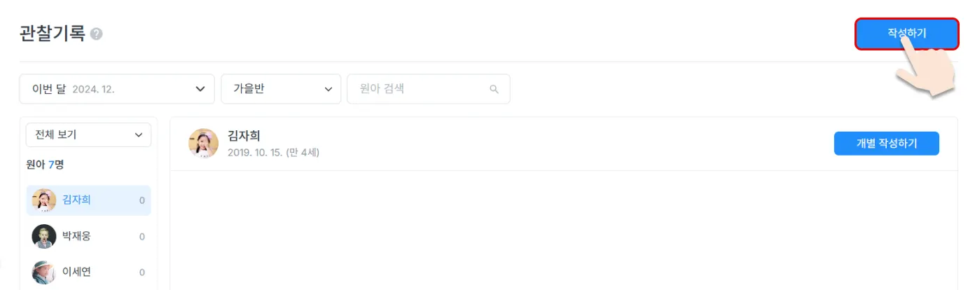 관찰기록 홈 화면에서 원아를 선택하고 우측 개별 작성하기 버튼을 선택해 주세요.