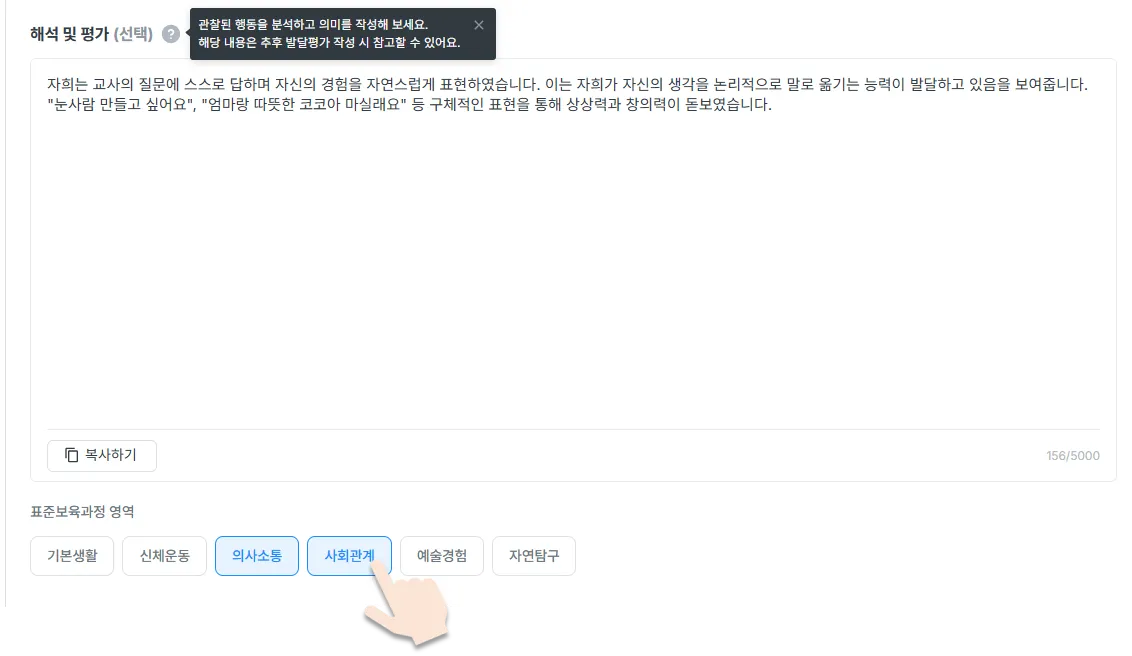 관찰기록에 대한 해석 및 평가 내용을 작성하고 해당 내용에 맞는 표준보육과정 영역을 선택해주세요.