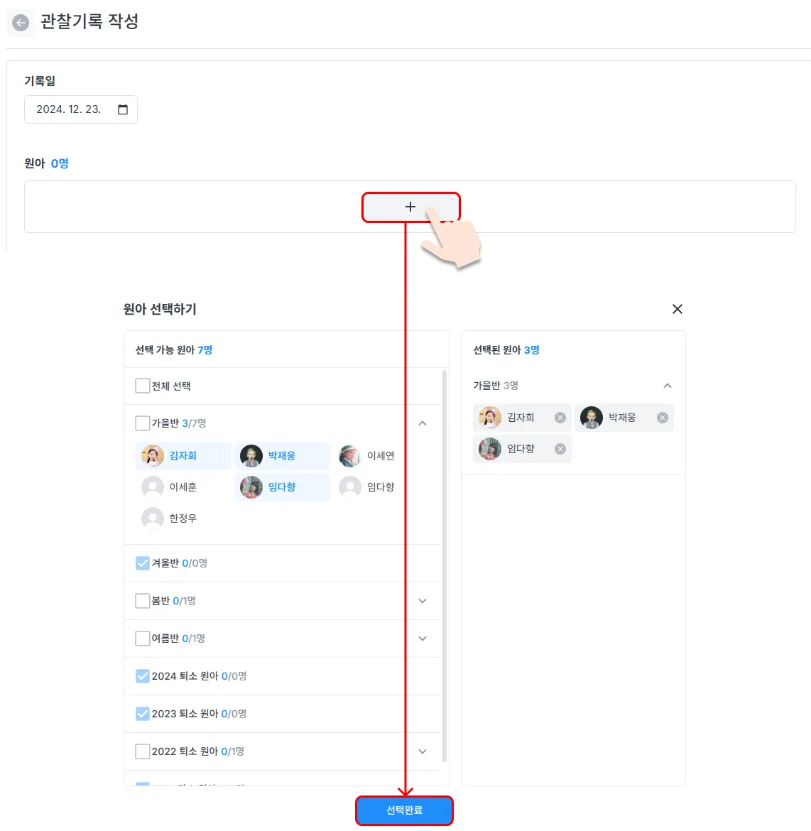 - 관찰기록을 작성할 원아를 선택한 후 선택완료 버튼을 클릭합니다.