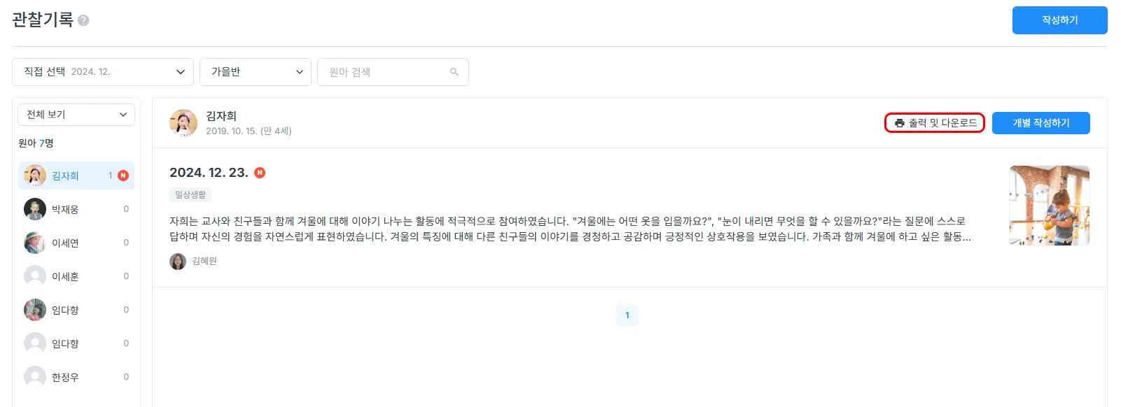 - 작성된 관찰기록이 1개 이상되어야 출력 및 다운로드 버튼이 노출됩니다.
