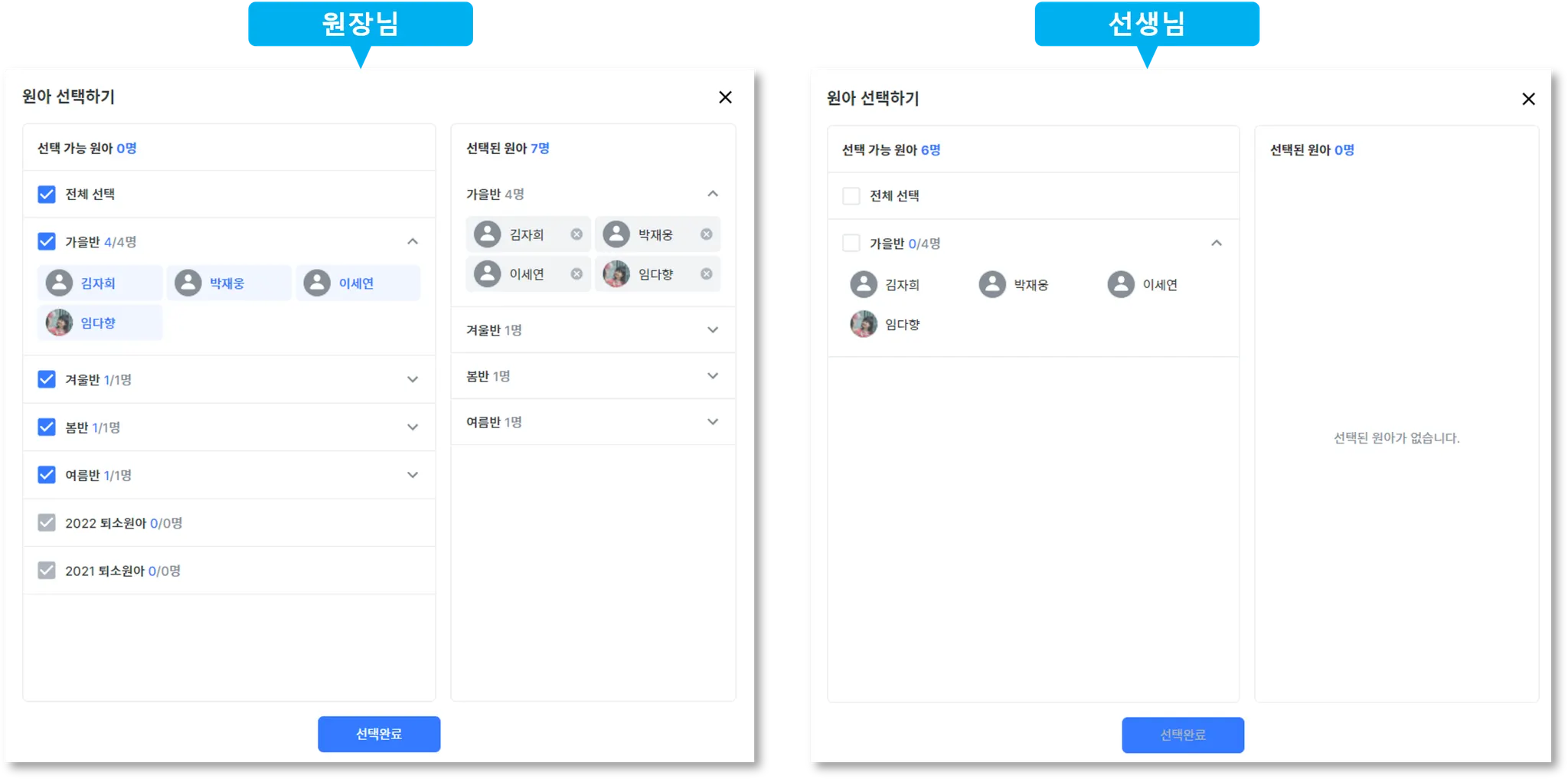 권한별로 원아 선택 팝업 화면이 다르게 보여집니다.