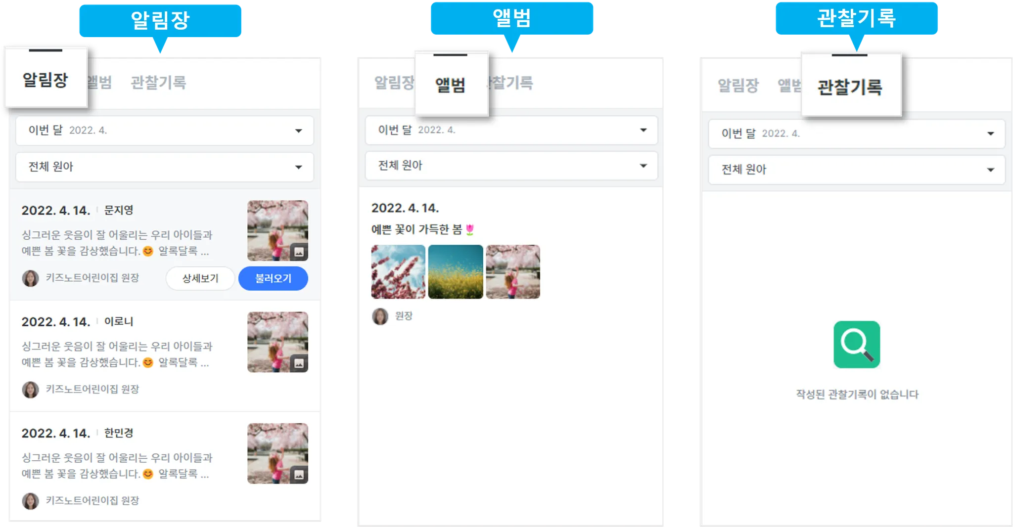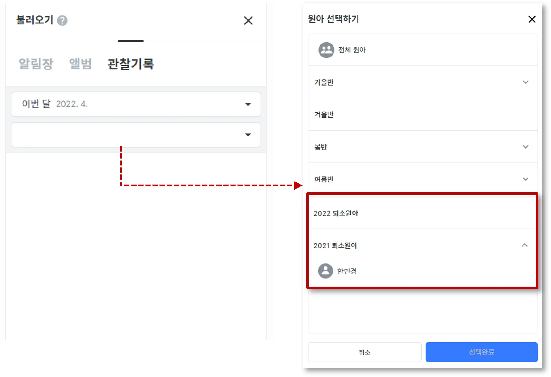 따라서 퇴소원아 관찰기록 작성을 위해 불러오기 선택 시 알림장과 앨범은 불러올 수 없으며 이전에 작성된 원아의 관찰기록만 불러올 수 있습니다.