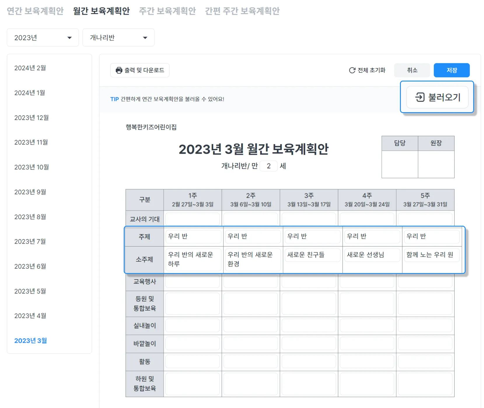 연간 보육계획안을 작성하셨다면, 불러오기 버튼을 클릭하여 주제/소주제를 자동으로 입력할 수 있습니다.