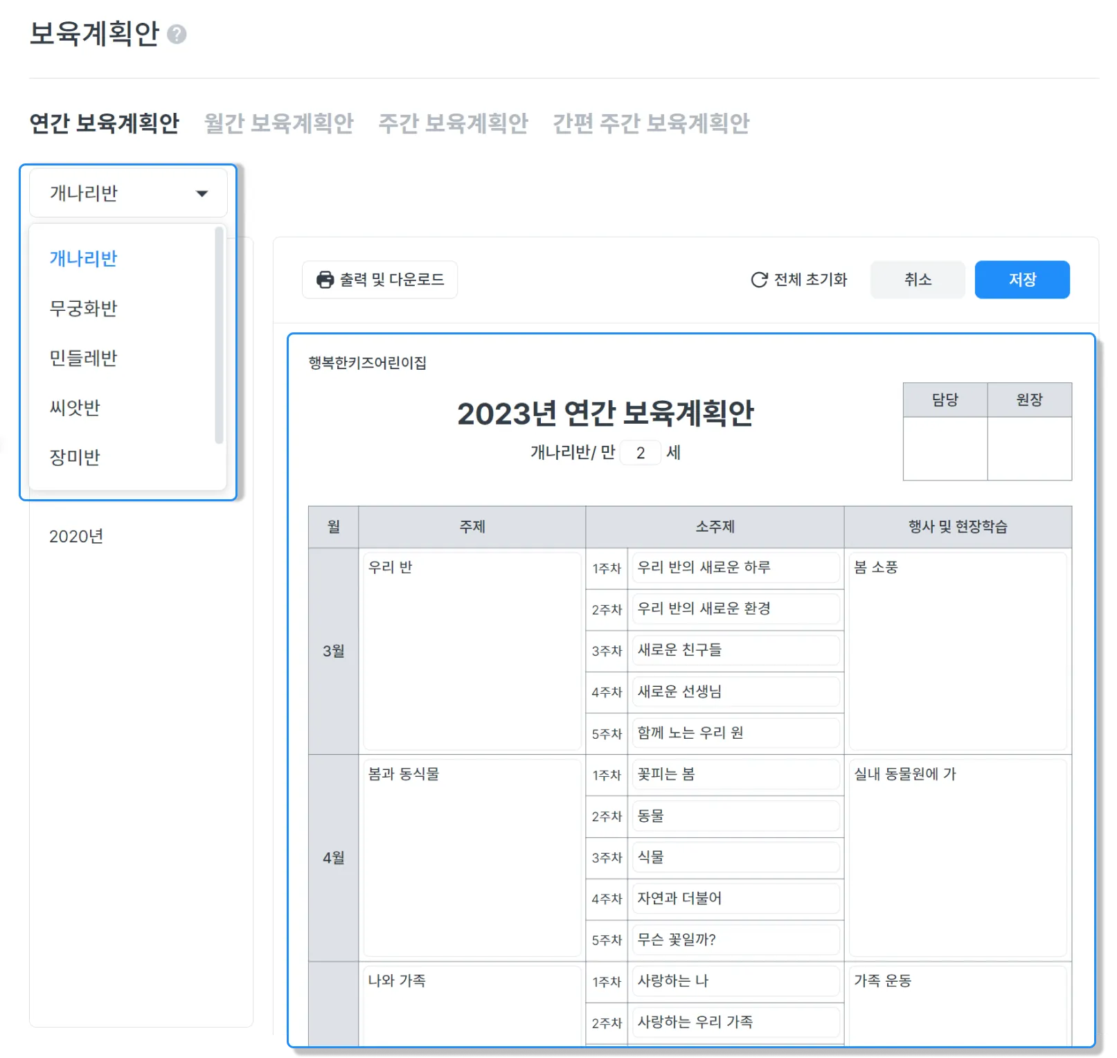 반 별로 주제/소주제/행사 및 현장학습을 작성합니다.