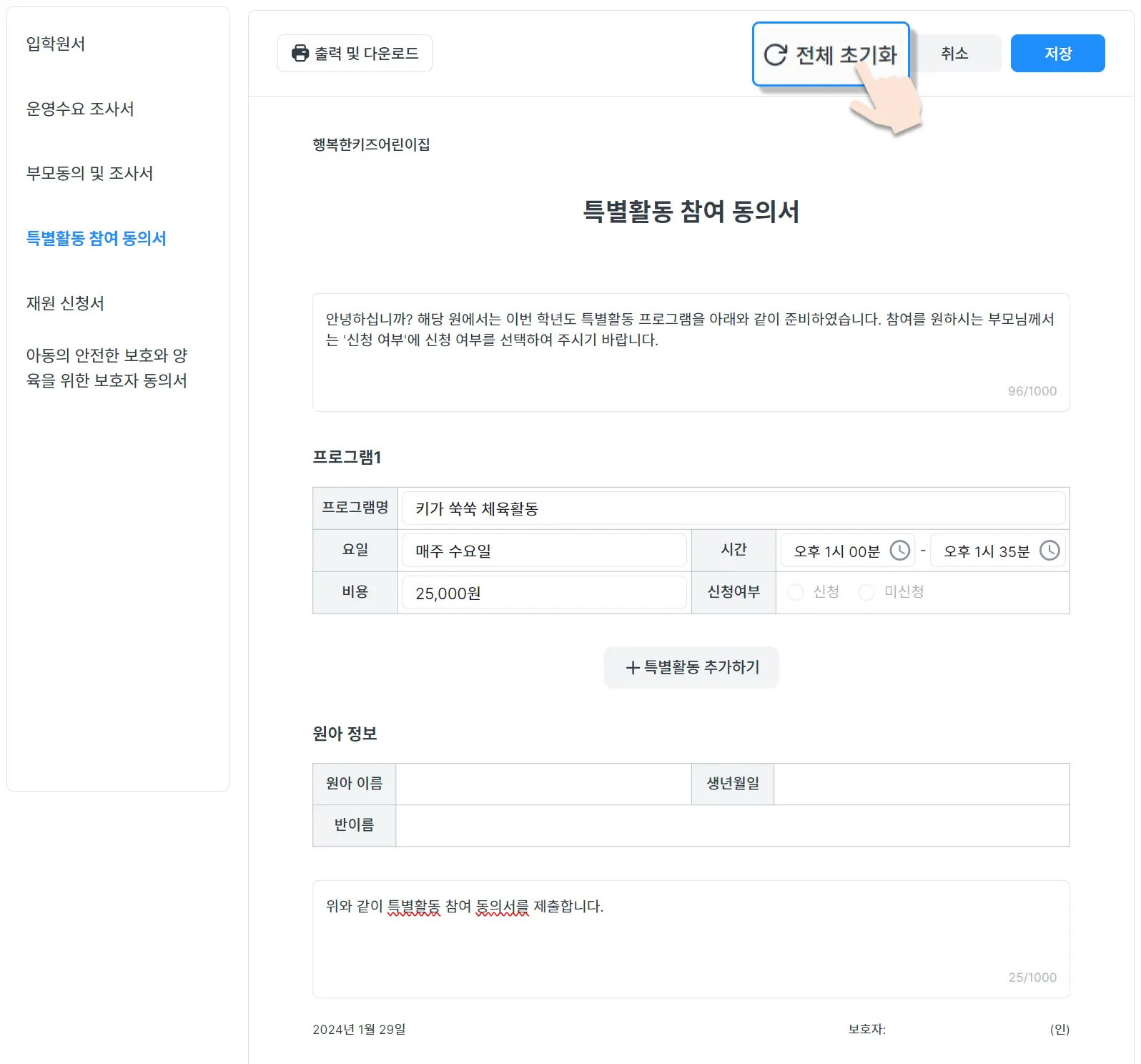 키즈노트 전자문서+에서 제공한 서식으로 되돌리고 싶다면, 전체 초기화 버튼을 눌러주세요.