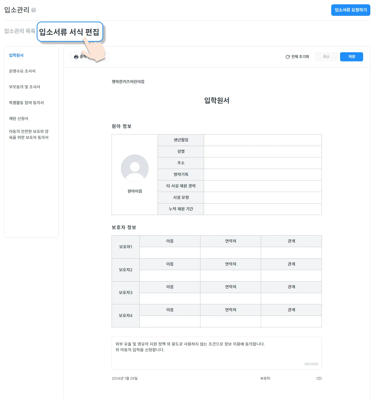 - 서식 편집 이전에 요청하여 받은 입소 서류는 편집한 서식으로 변경되지 않습니다.