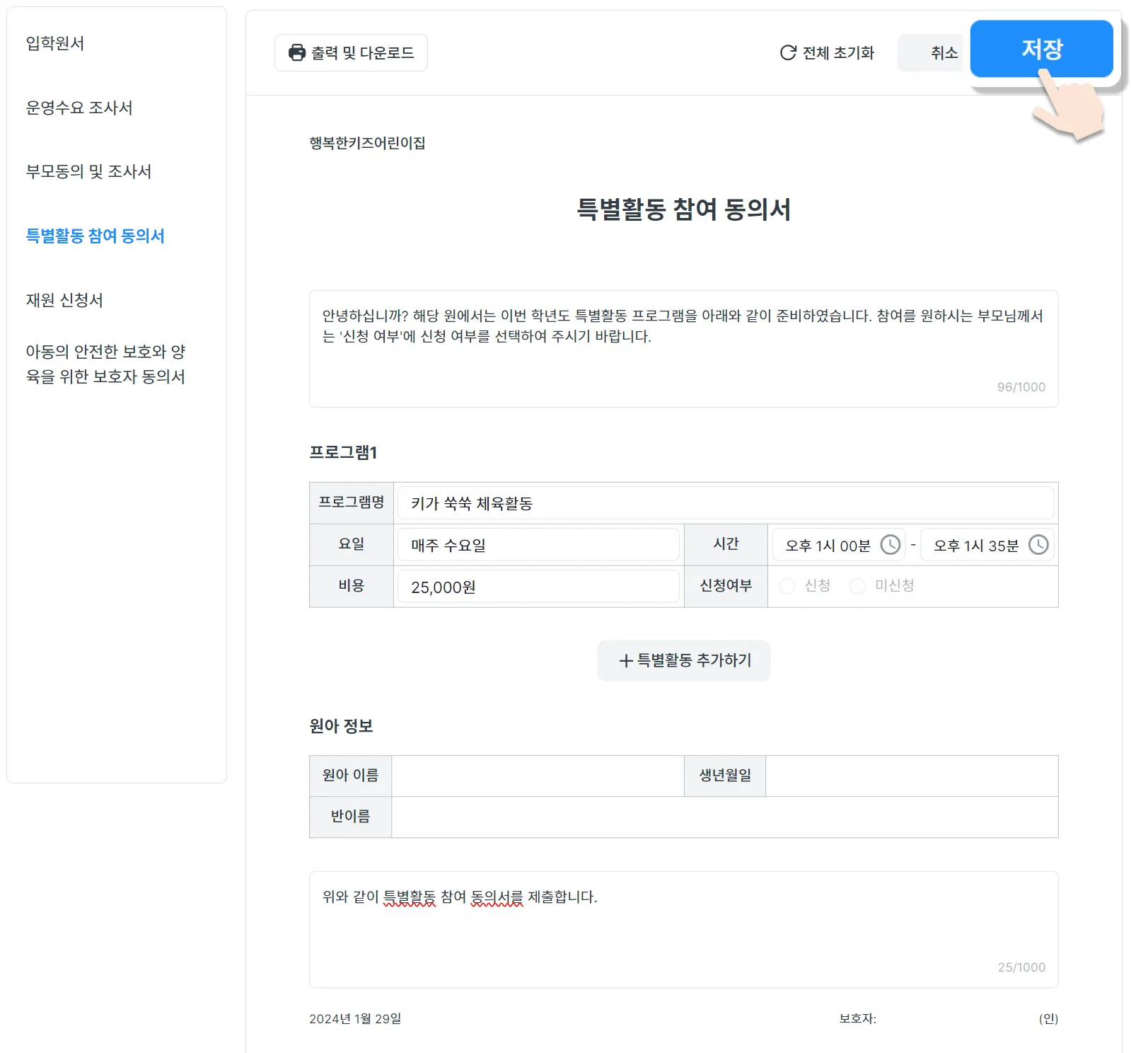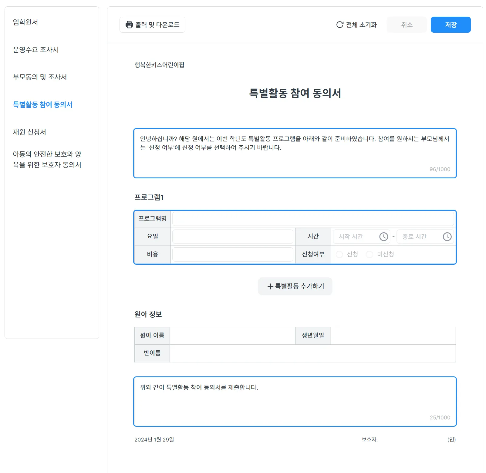 특별활동 참여 동의서는 ‘입소서류 서식편집’ 메뉴에서 프로그램을 등록 후 요청이 가능합니다.