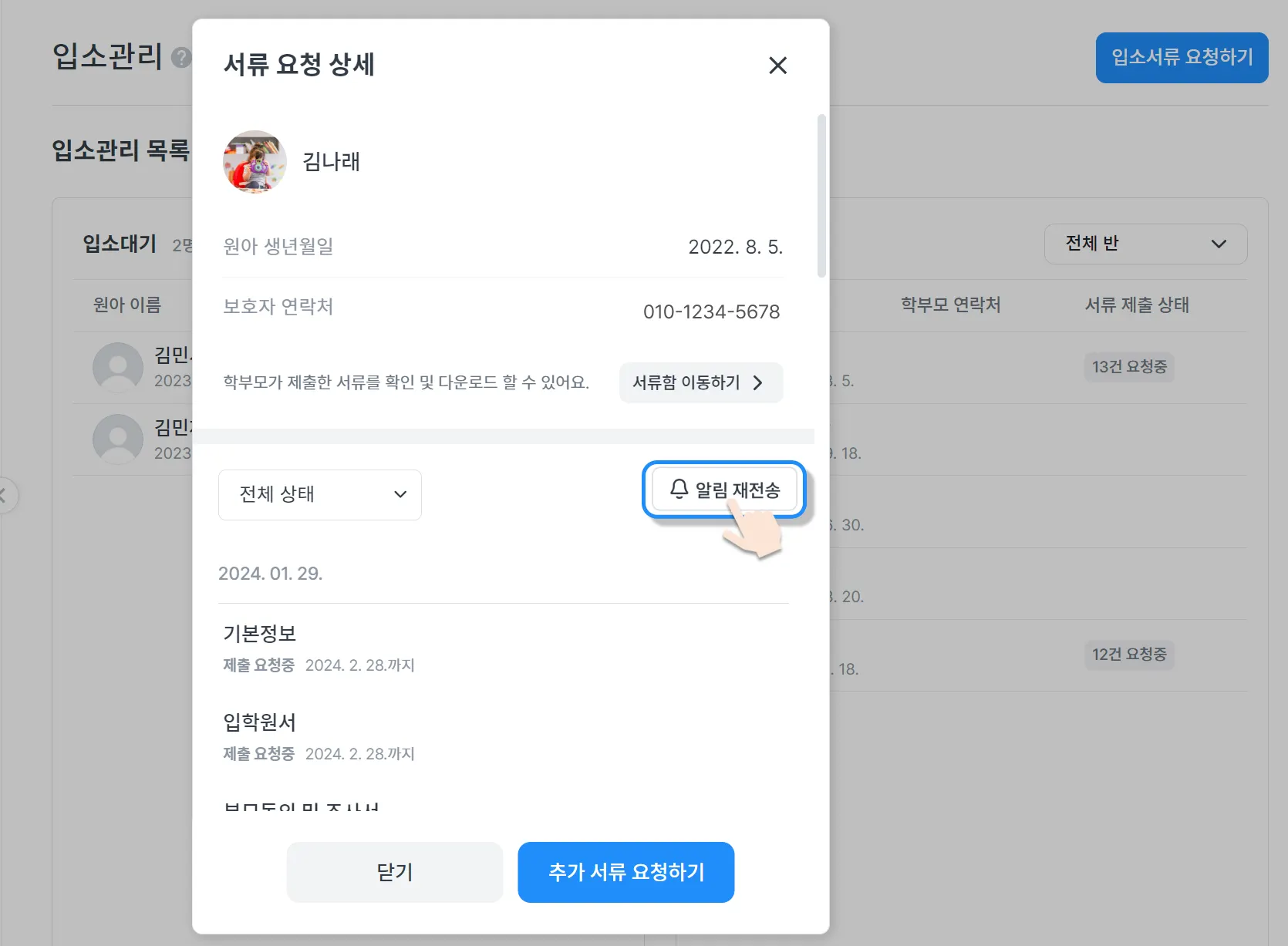 아직 제출되지 않은 서류들이 있다면, 알림 재전송버튼을 클릭하여 한번 더 학부모님께 알려주세요!