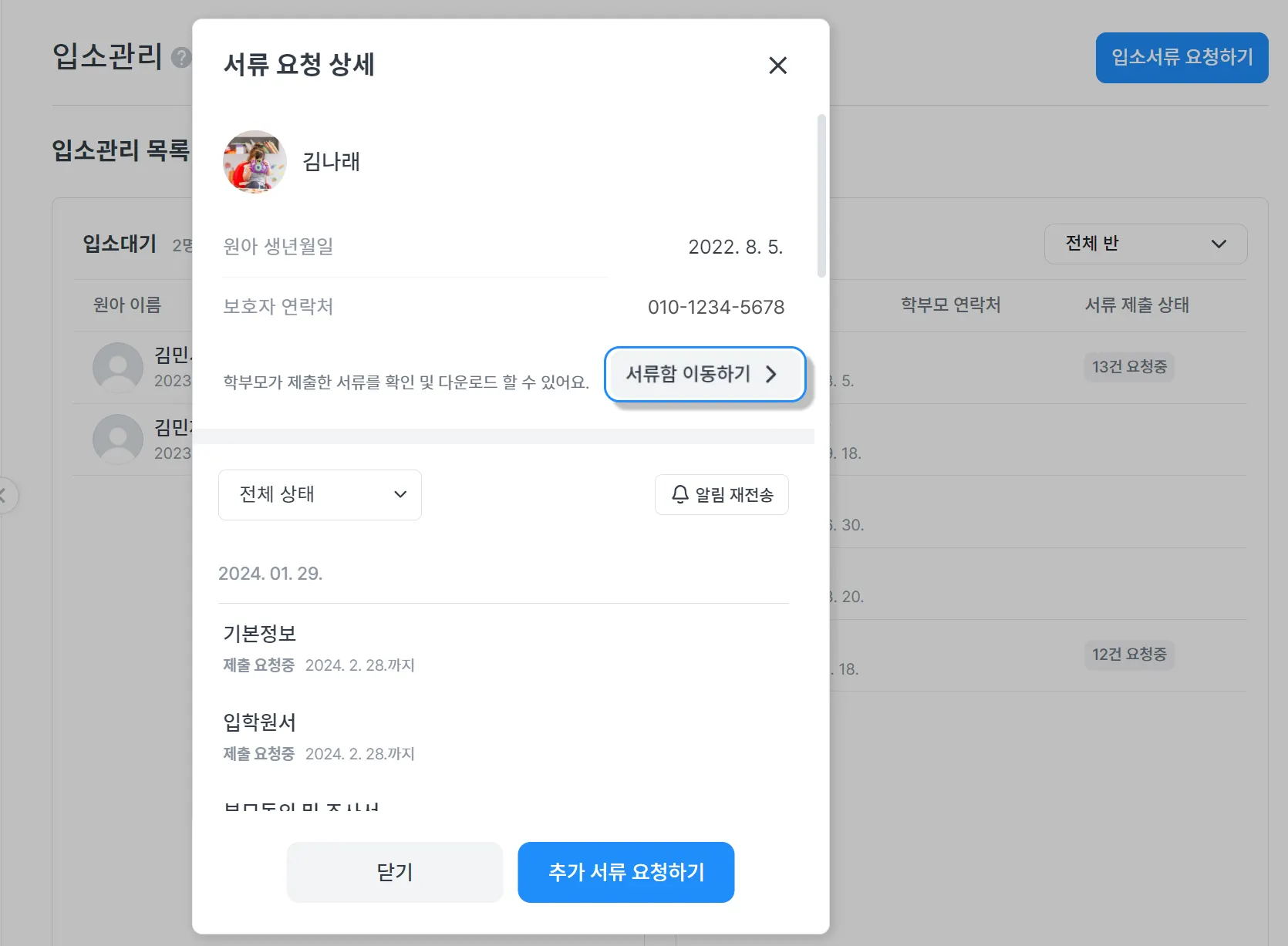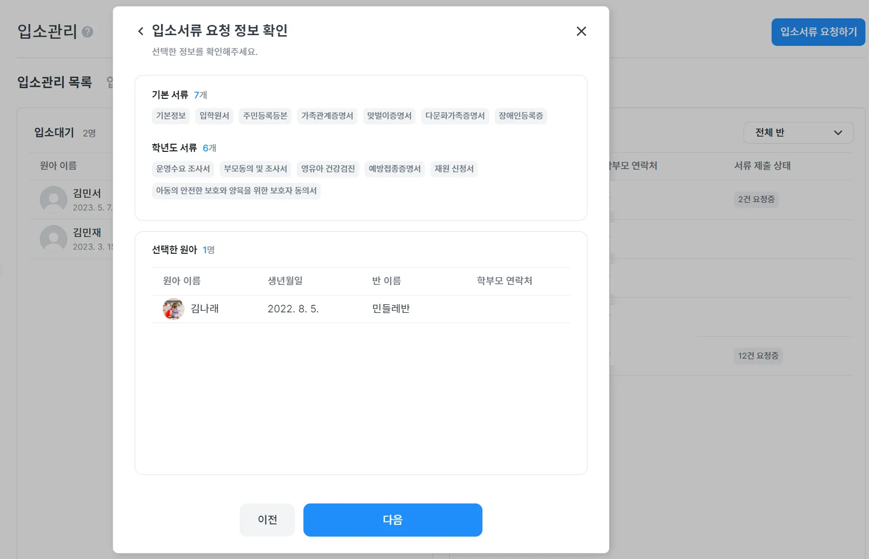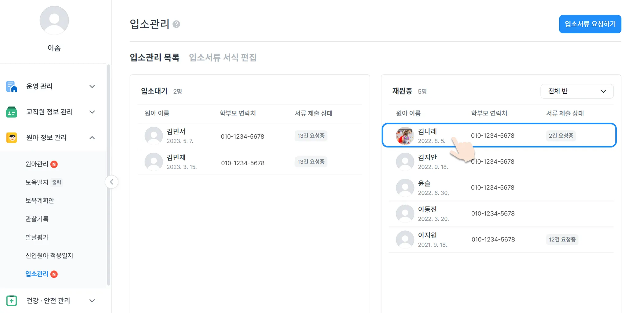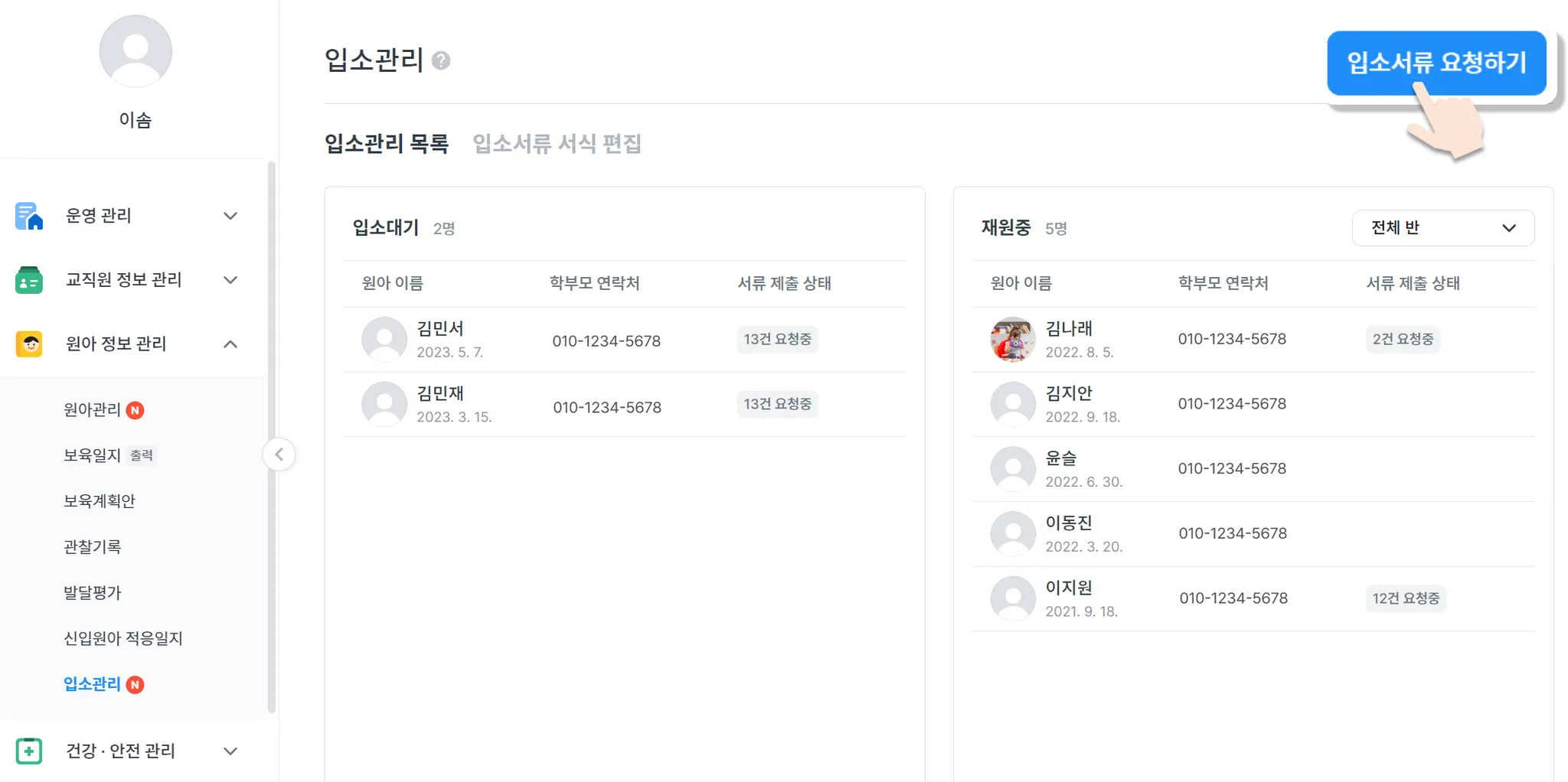 입소관리 목록에서 원아별로 요청 중인 서류가 몇 건인지 바로 확인할 수 있어요.