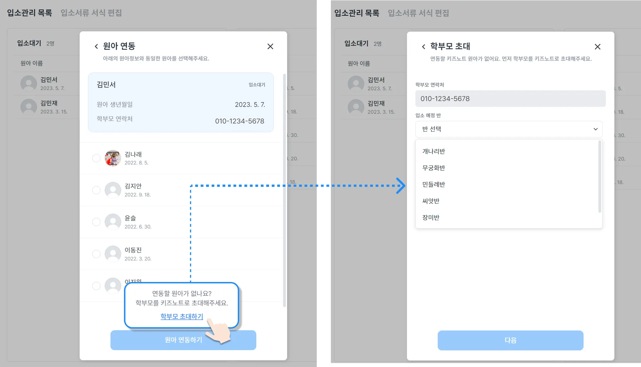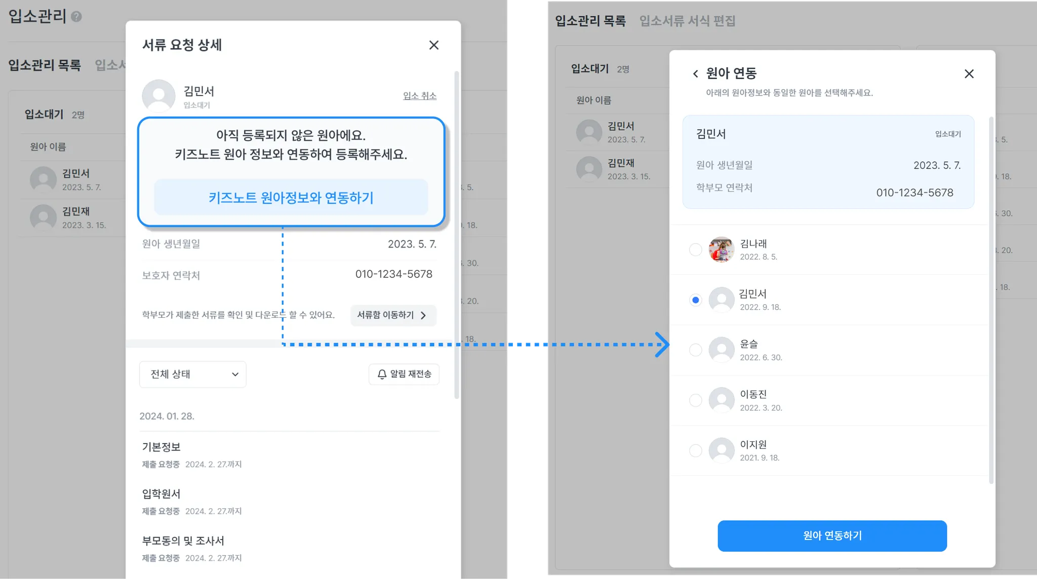 입소대기 원아 선택 후 키즈노트 원아정보와 연동하기 버튼을 클릭해 주세요.