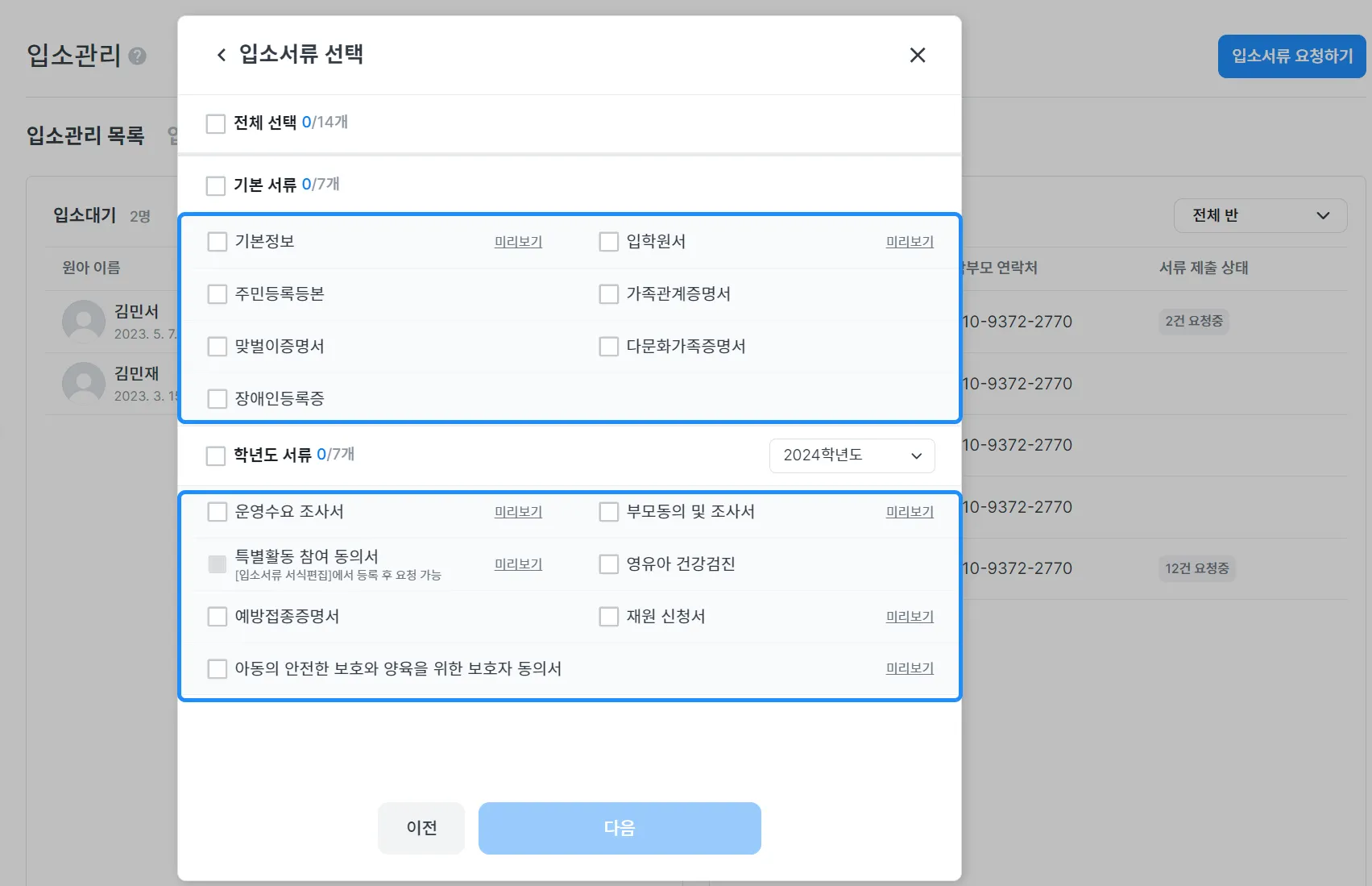 원아를 선택했다면, 필요한 입소서류를 선택해 주세요.