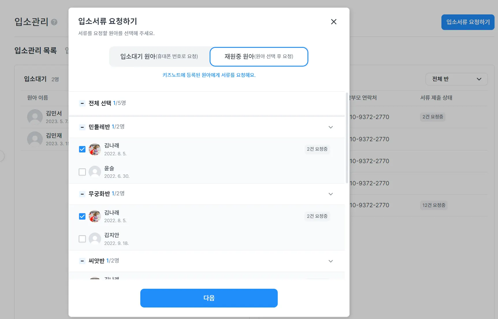 입소서류 요청하기를 클릭하여 요청할 원아를 선택해 주세요.