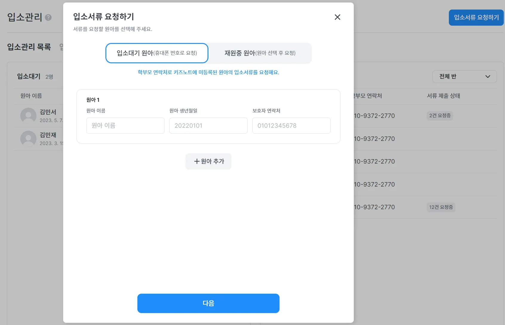+원아추가 버튼으로 여러 명의 학부모에게 한번에 요청할 수 있습니다.