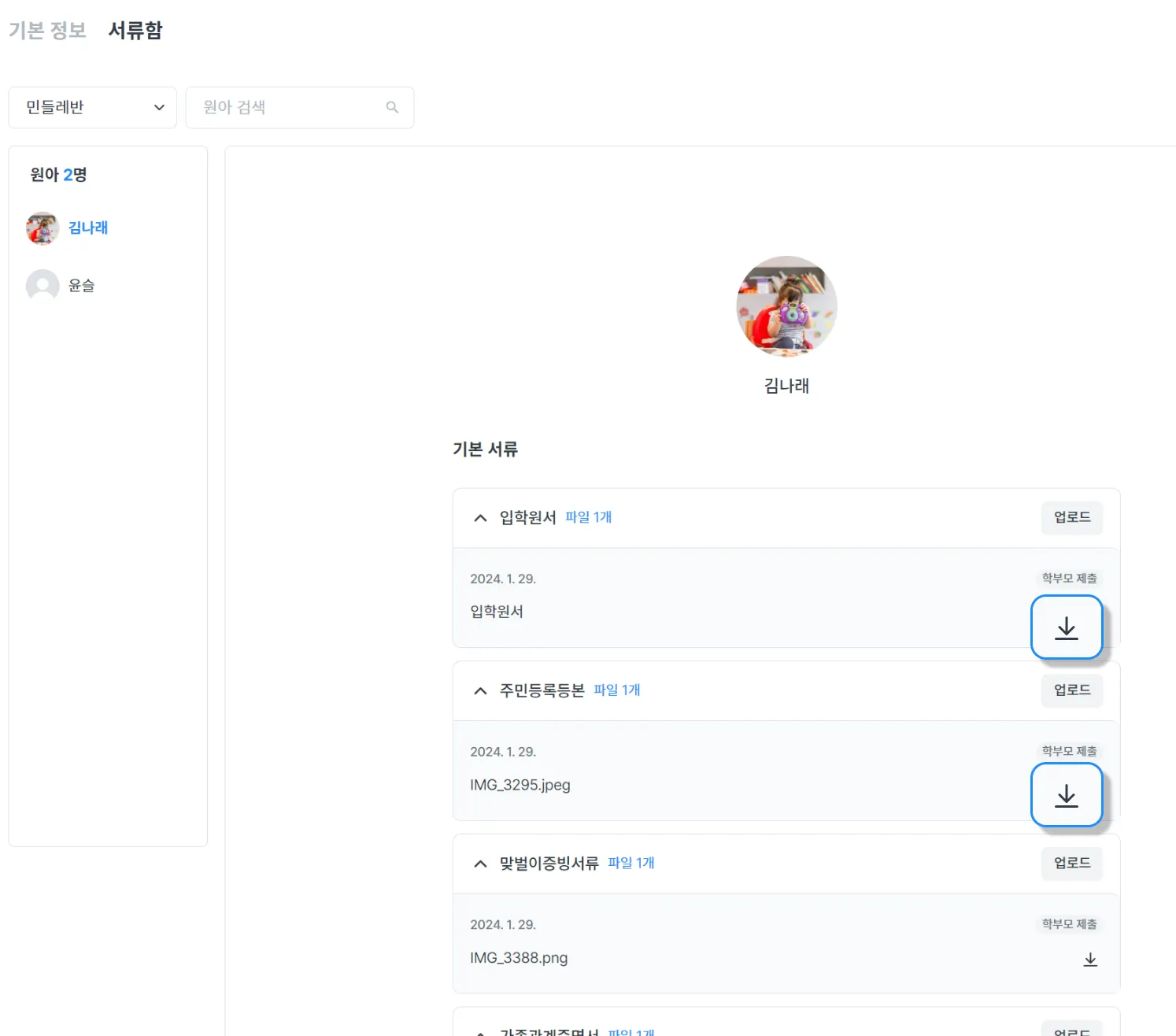 학부모님이 제출한 서류 이외의 직접 업로드하여 보관하고 싶으신 경우, 업로드 버튼을 클릭하여 파일을 업로드할 수 있습니다.