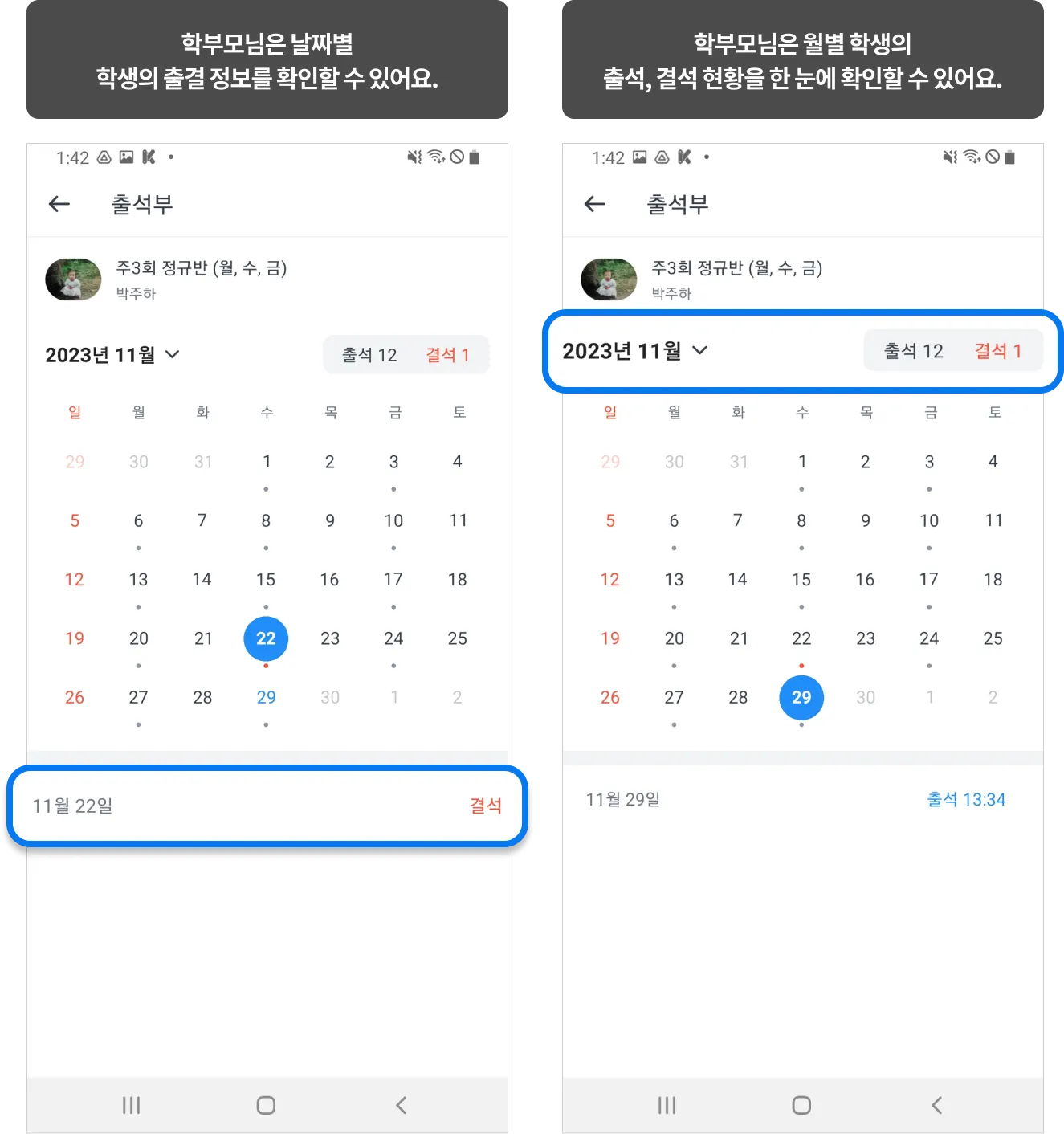 출결 서비스는 원장님, 선생님께서만 이용하실 수 있는 기능입니다.