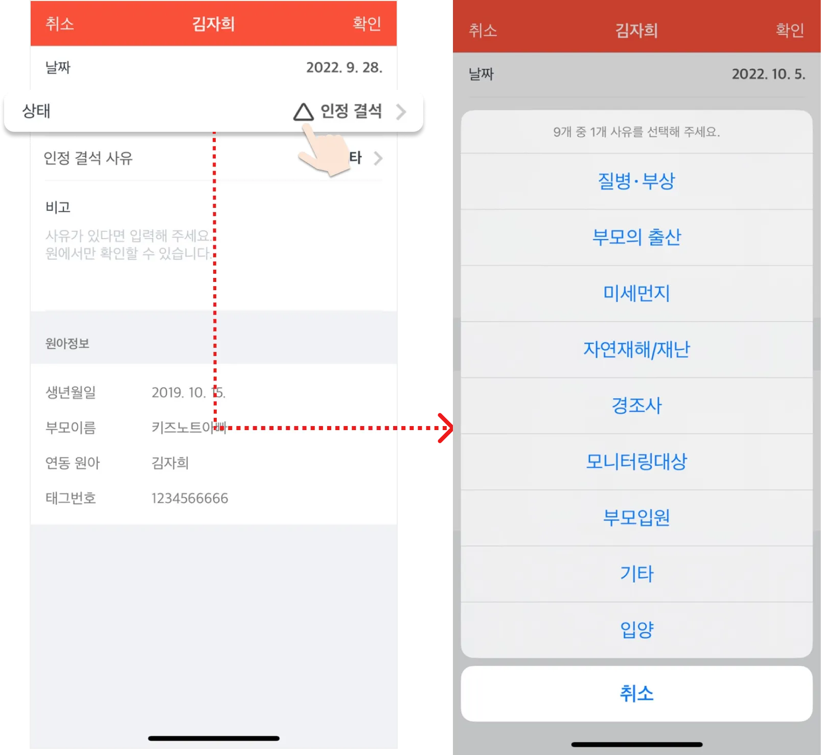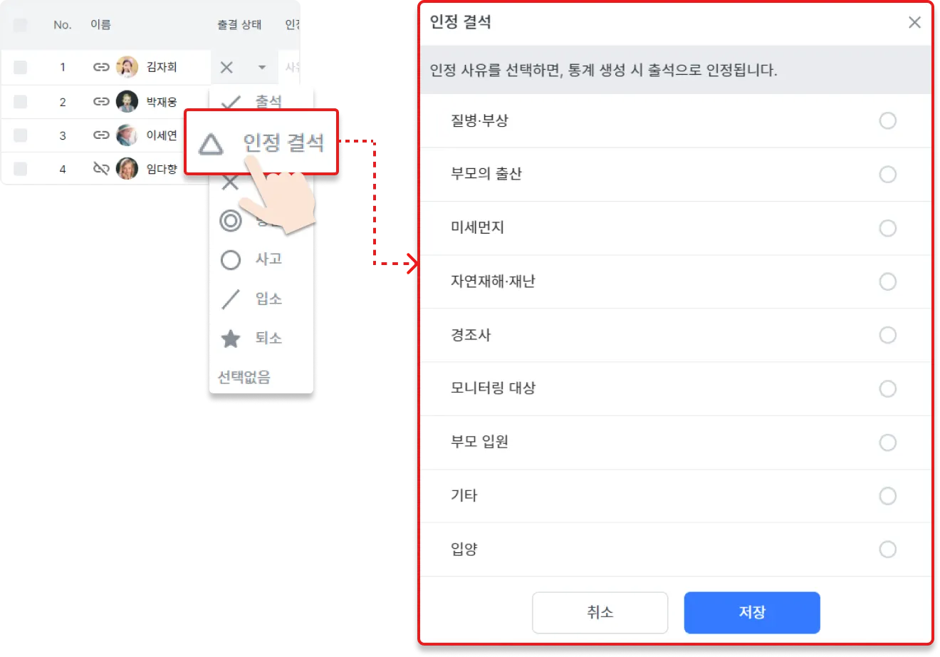 인정결석을 선택하면 사유 선택 팝업이 나타납니다.