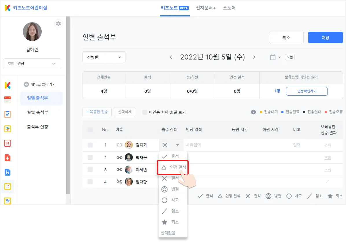 출석부의 출결 상태에서 인정결석을 선택해주세요.