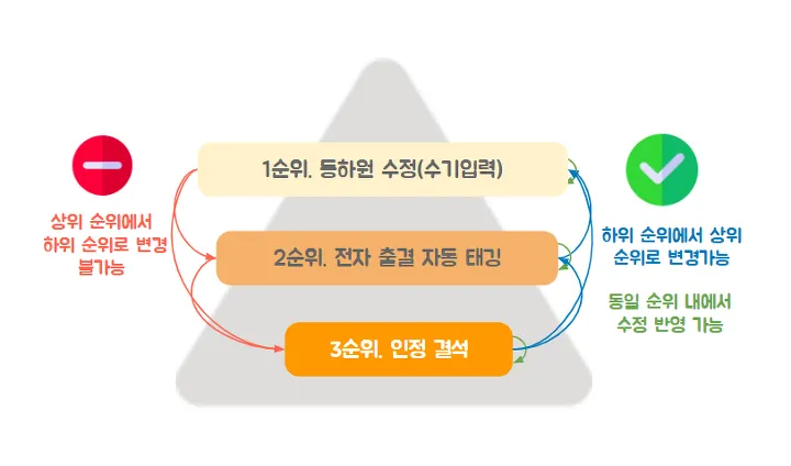 2순위 전자출결 자동태깅을 먼저한 경우에도 3순위 인정결석으로 변경 불가능합니다.