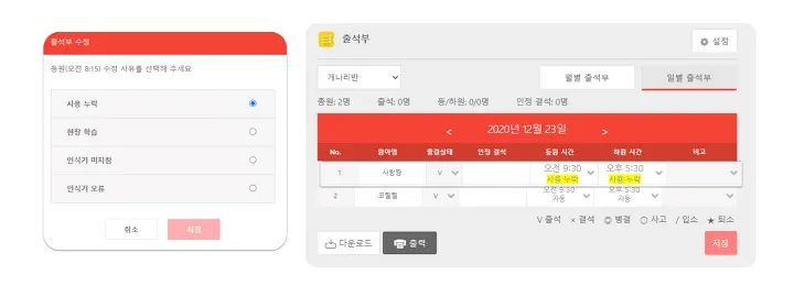 - 단 , 수정 시 출석상태의 연계 우선 순위 (1순위 등하원 수정 > 2순위 자동태깅 > 3순위 인정결석 및 결석)에 따라 수정 제한될 수도 있습니다.