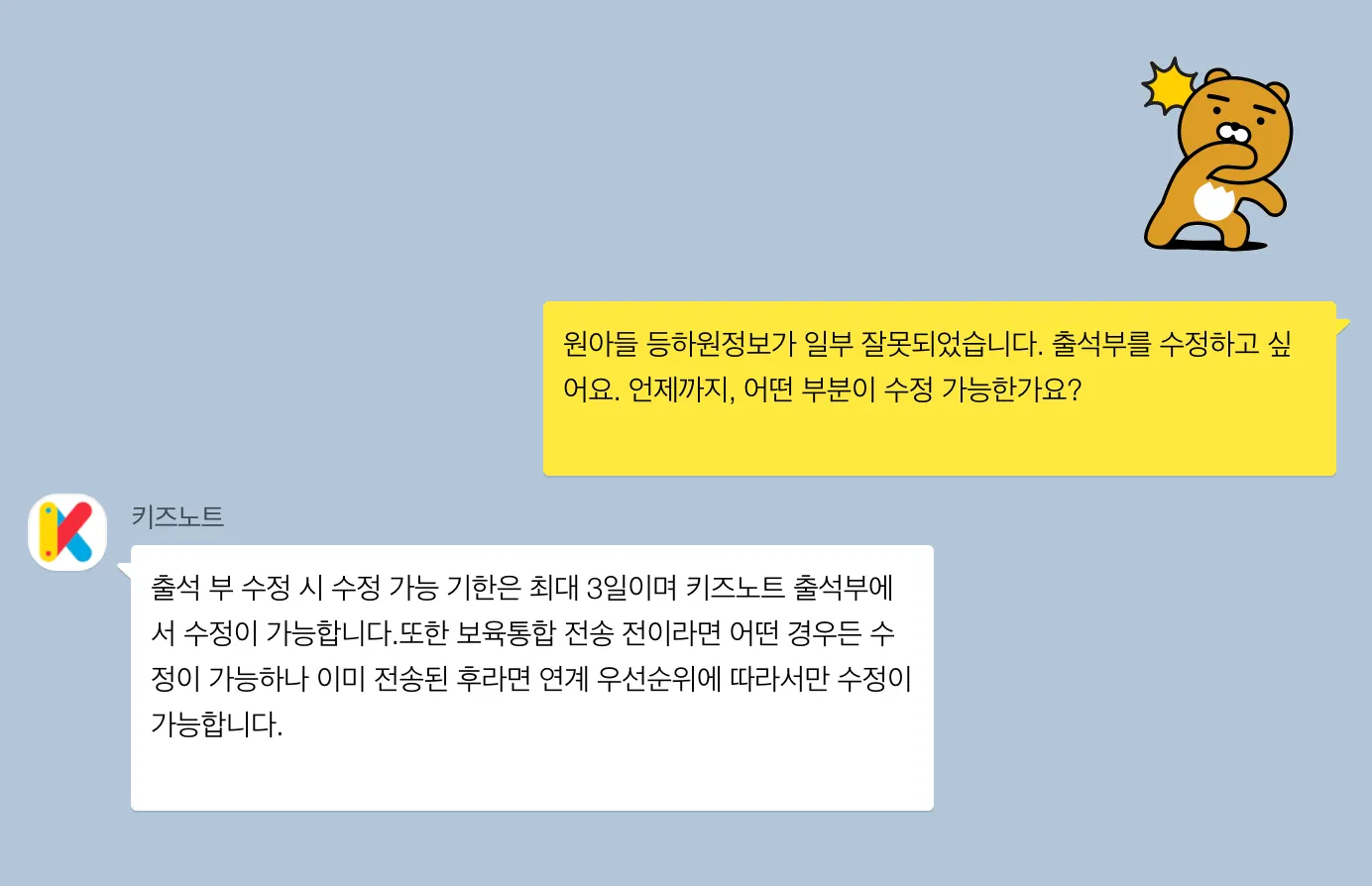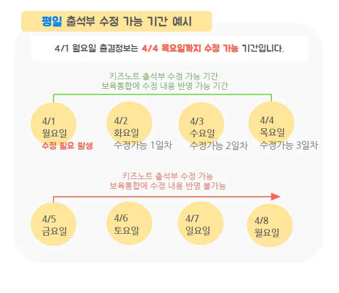 - 출석일이 3일이 지난 경우에는 키즈노트에서 수정할 수 있지만 어린이집 지원 시스템으로 반영되지 않습니다.