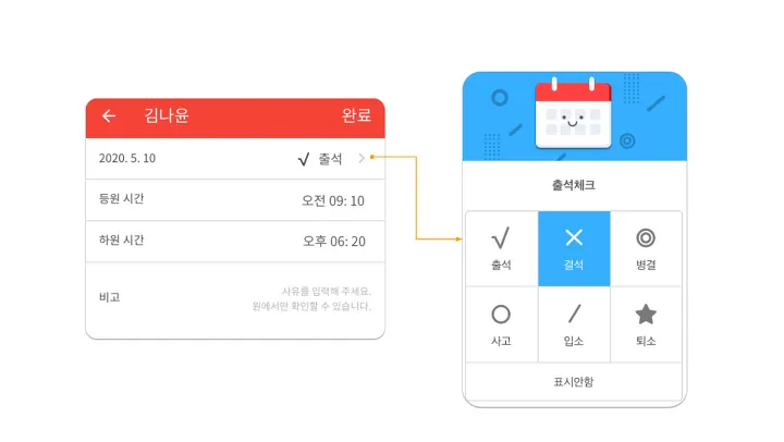 Mobile) [인정결석]결석으로 체크한 경우에만 추가로 인정결석을 체크할 수 있습니다. 인정 사유를 선택하면 통계 생성 시 출석으로 인정 됩니다.